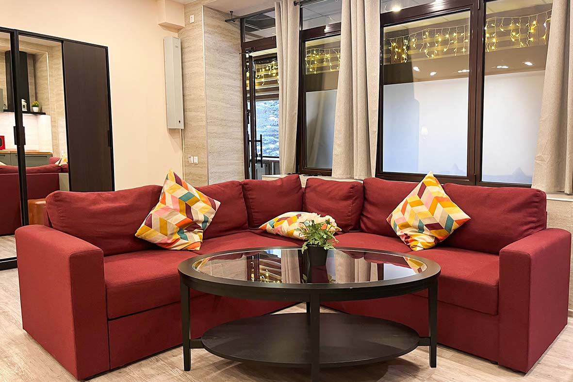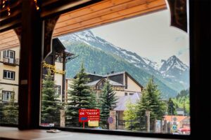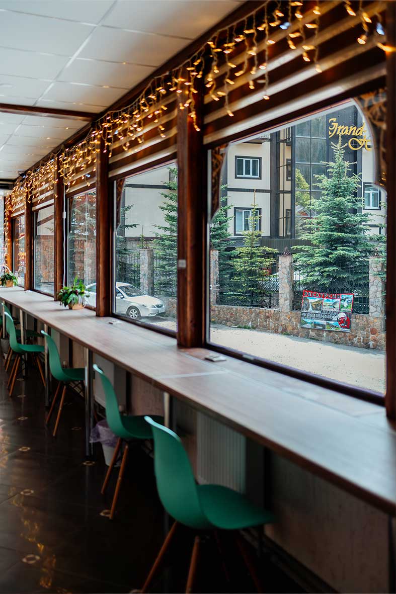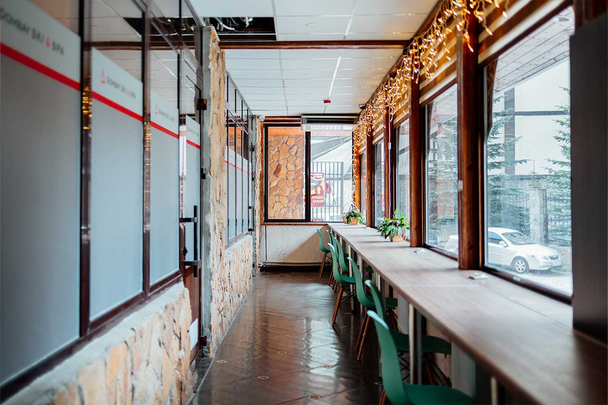 Окна студии выходят в общий коридор, где гости могут уютно провести время с чашкой горячего чая с видом на главную улицу Домбая, вершины гор и сувенирный рынок.