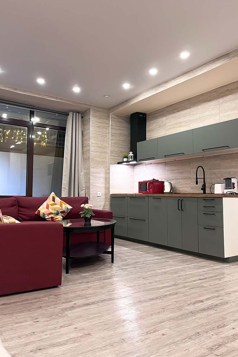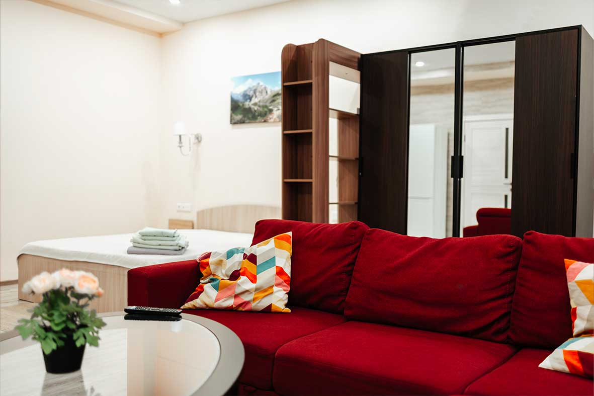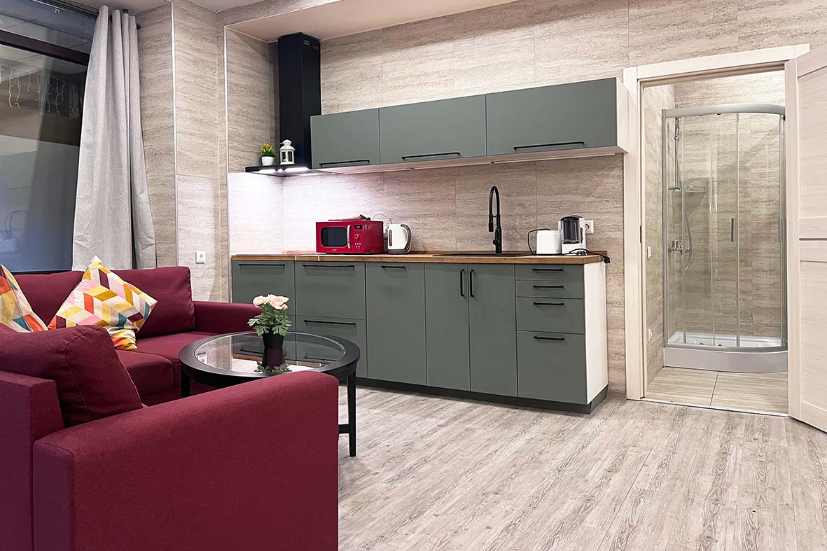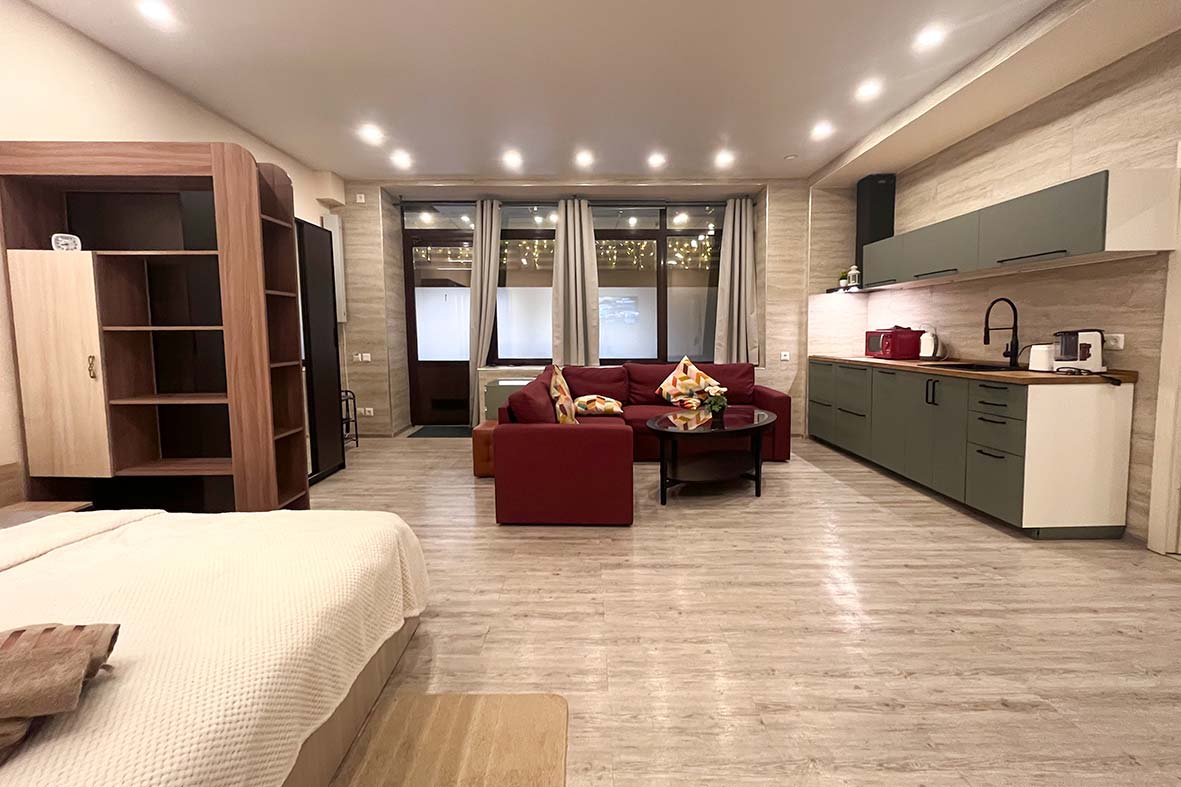 Квартира-студия 1 расположена на одном уровне с рестораном Бизон.