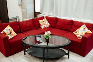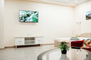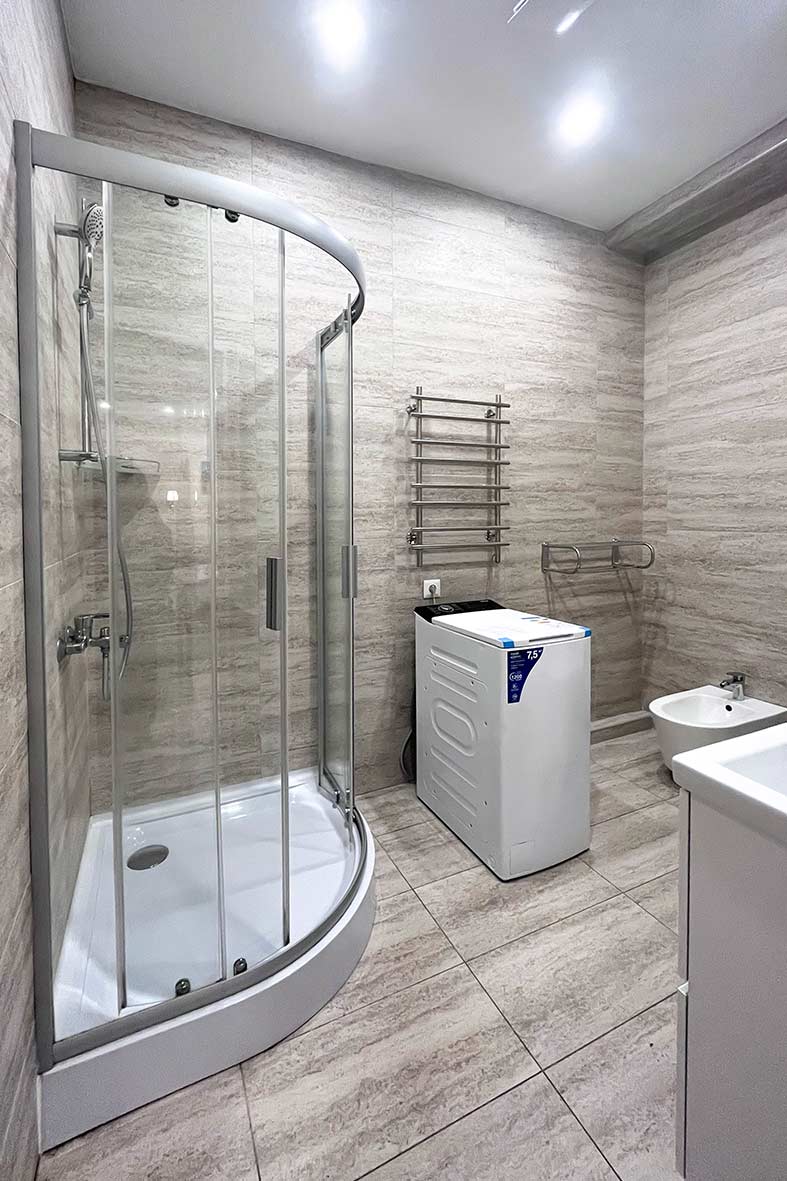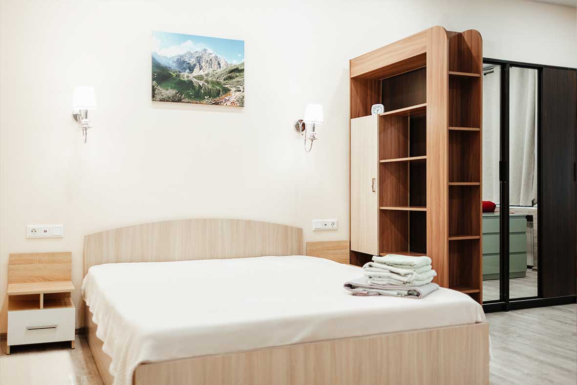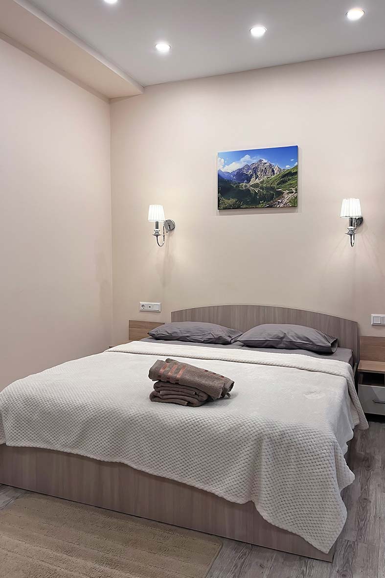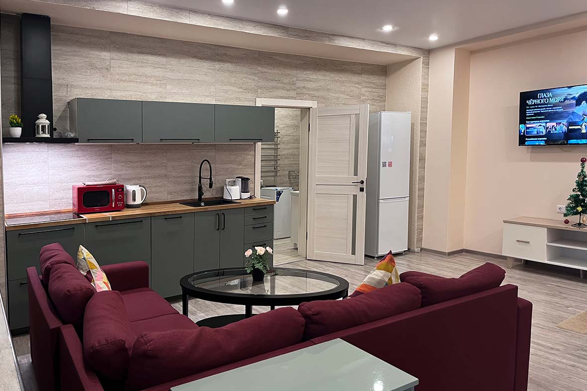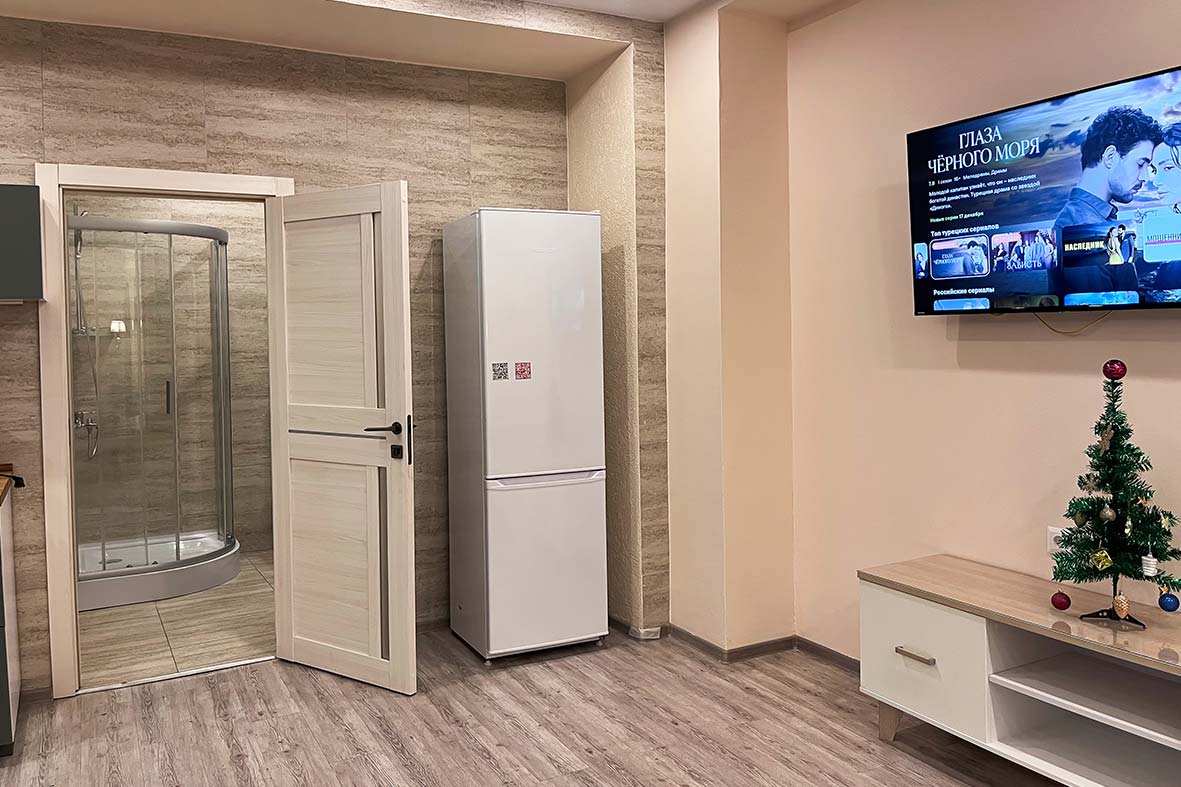 Квартира делится на три зоны: гостевую, кухонную и спальную. В спальной зоне установлена двуспальная кровать, в гостевой зоне – раскладной диван и телевизор. Санузел оснащен душевой кабиной.