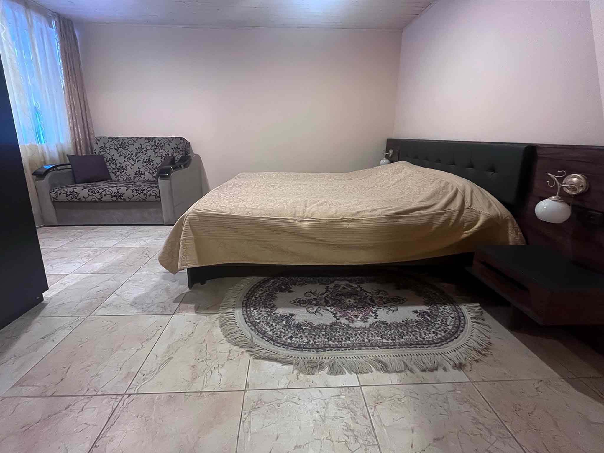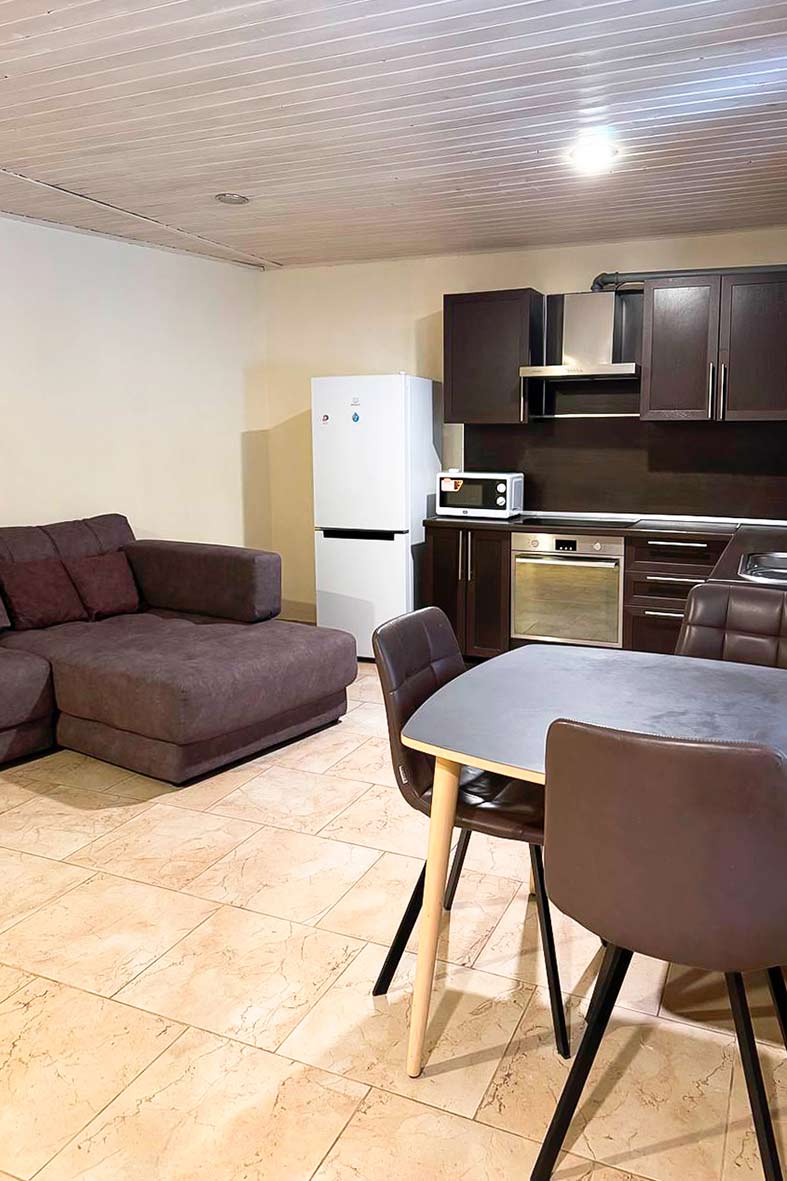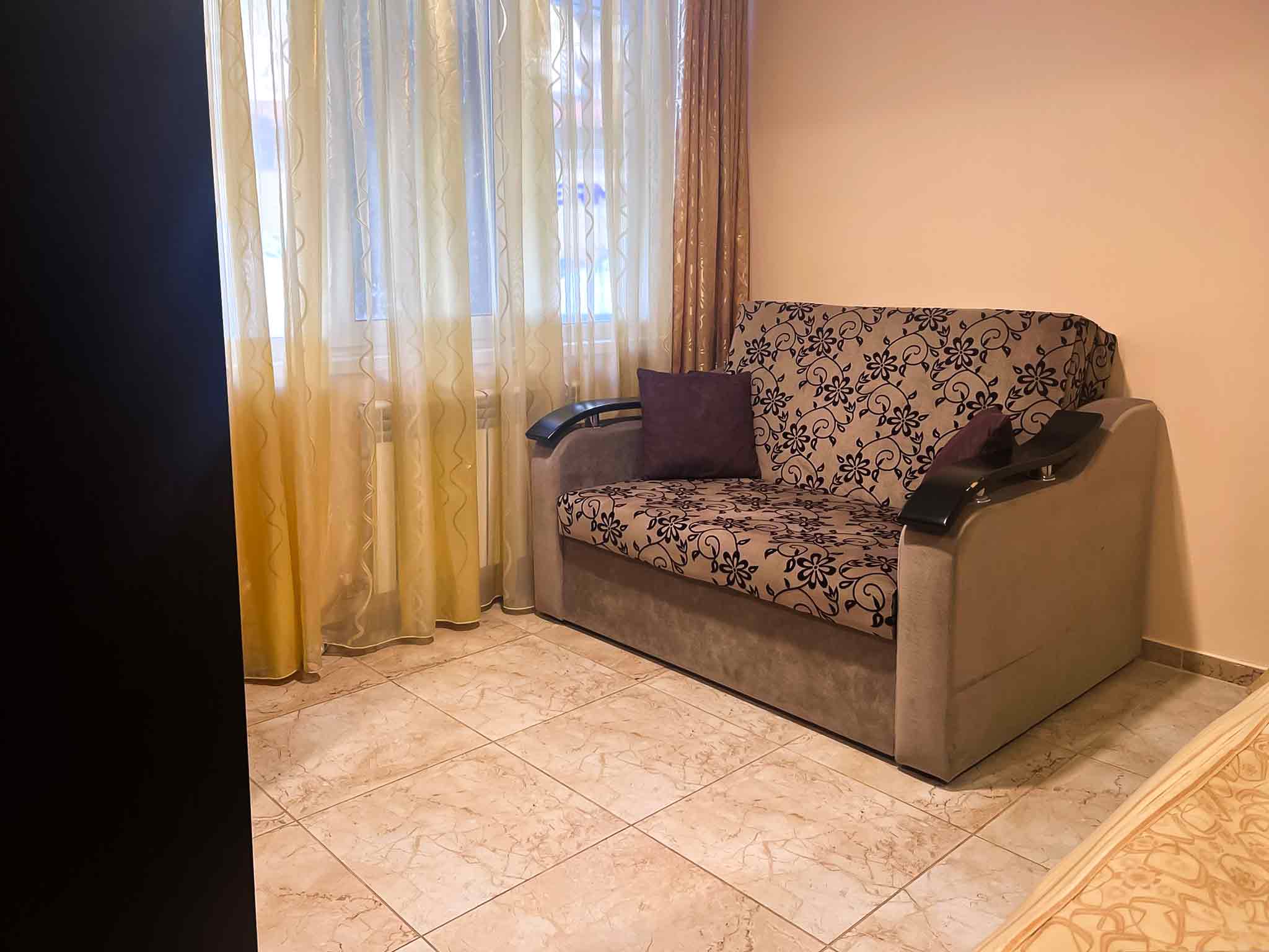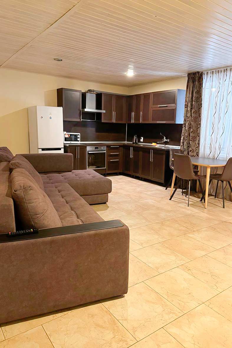 Квартира делится на кухню-гостиную, изолированную спальню и санузел. В гостиной расположен раскладной диван, в спальне – двуспальная кровать и раскладной диван. Санузел оснащен душевой кабиной.