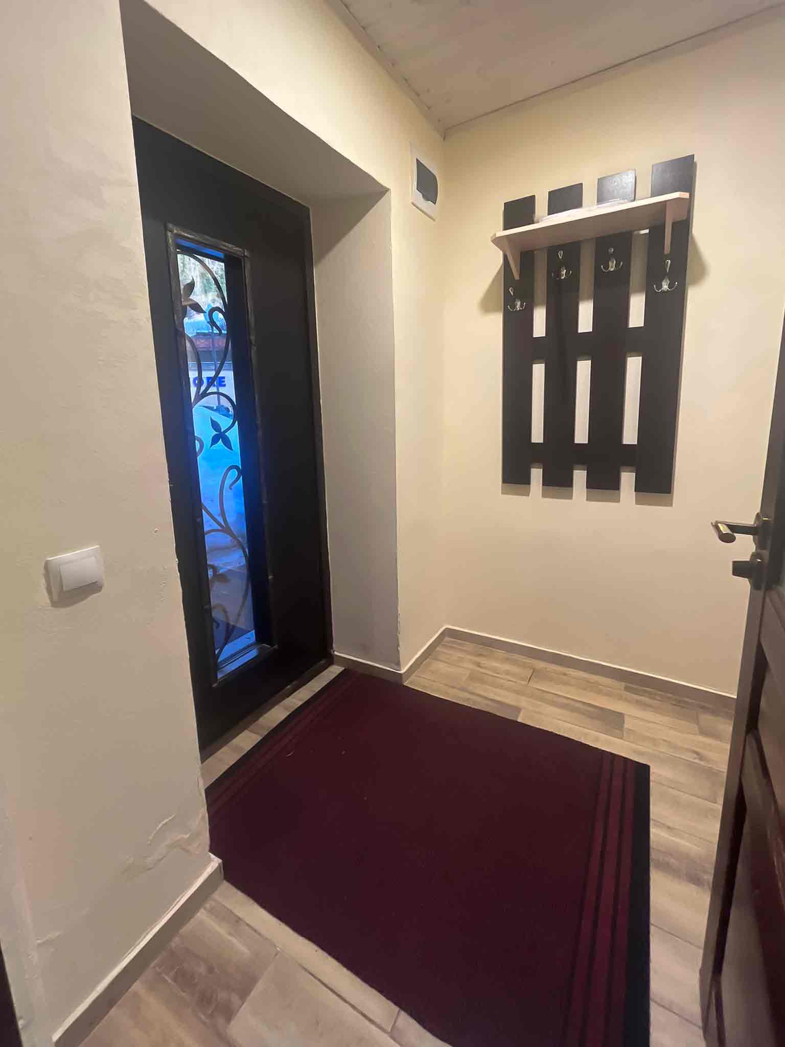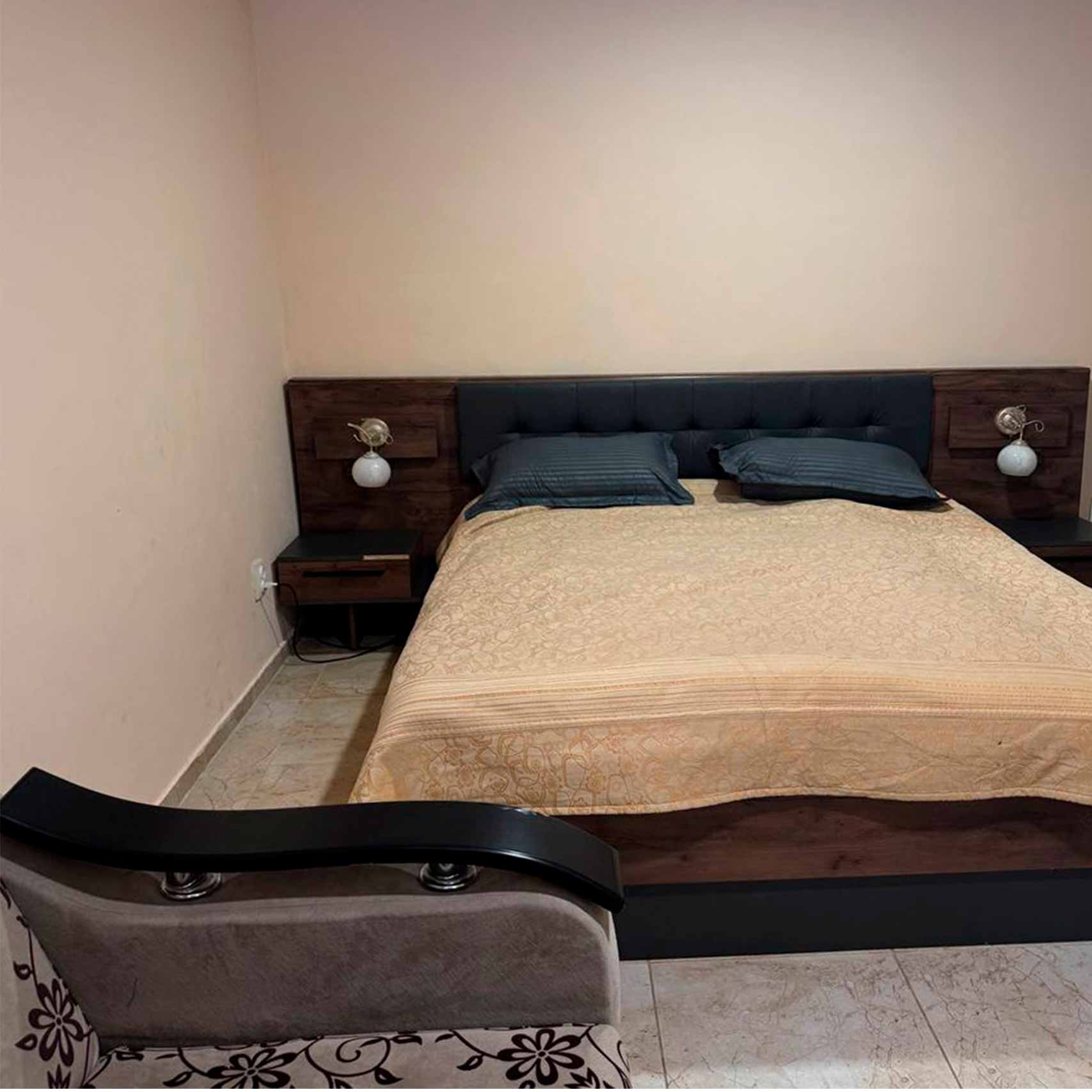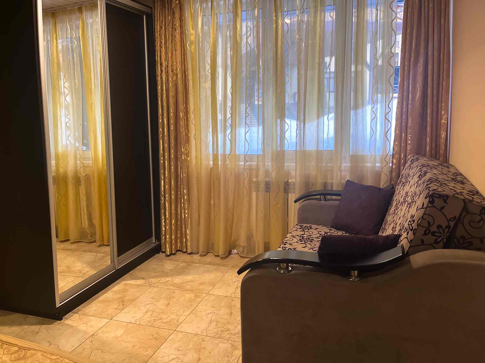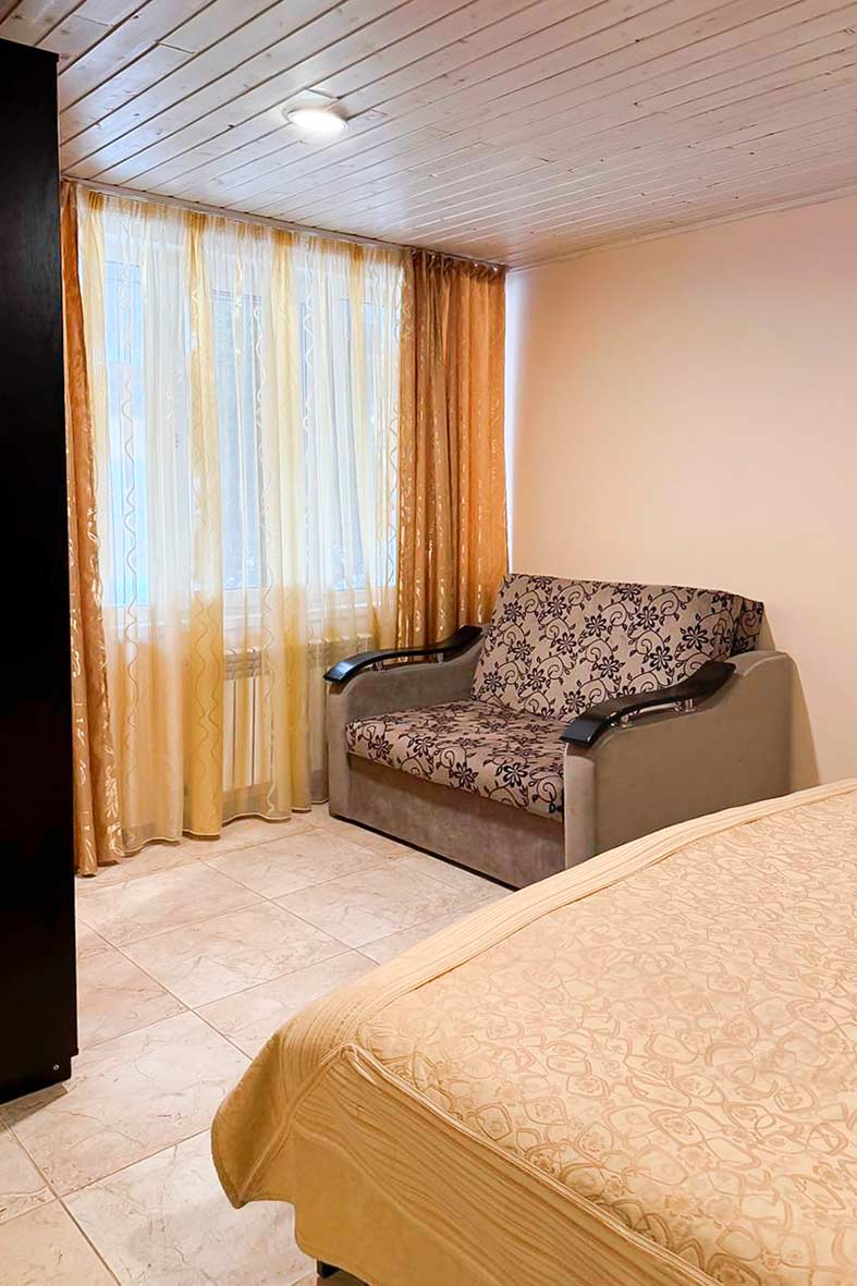 Квартира делится на кухню-гостиную, изолированную спальню и санузел. В гостиной расположен раскладной диван, в спальне – двуспальная кровать и раскладной диван. Санузел оснащен душевой кабиной.