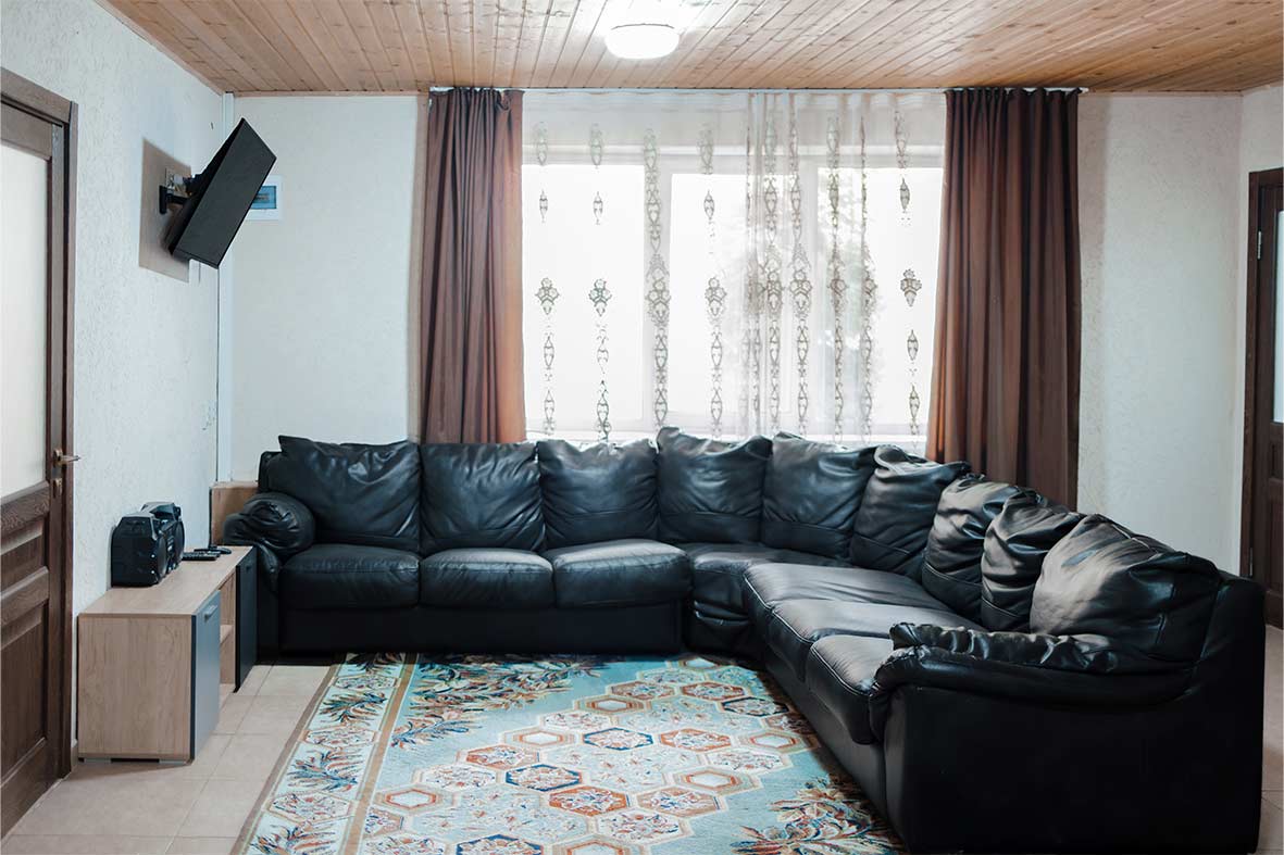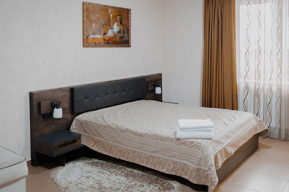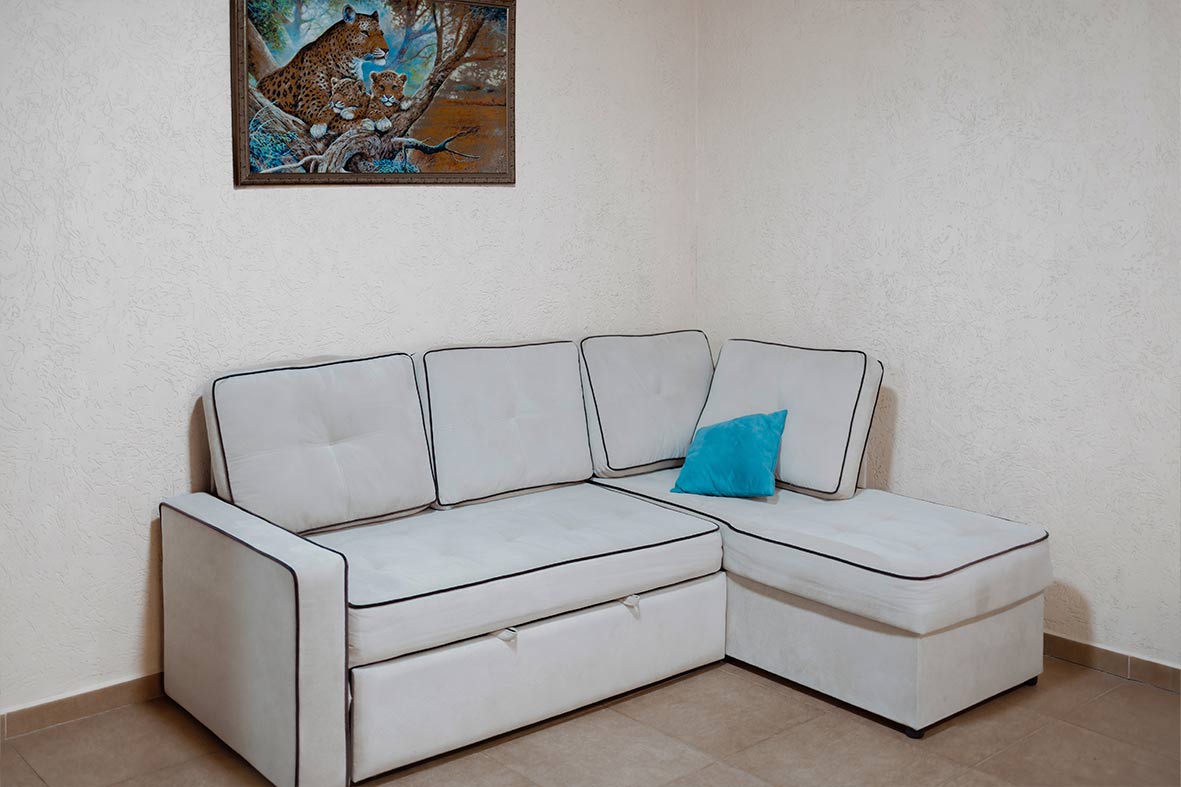 Квартира делится на просторную кухню-гостиную, две изолированные спальни, два санузла и сауну. В гостиной расположен раскладной диван. В каждой спальне – двуспальная кровать и раскладной диван. Из спален из выход на небольшой балкон. В бунгало два санузла. Первый небольшой санузел оснащен раковиной и унитазом. Во втором просторном санузле размещается сауна, душ с бочкой, раковина и унитаз.