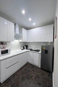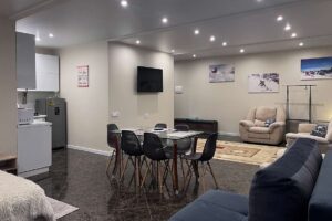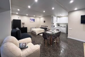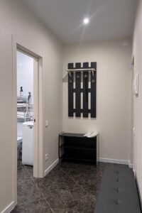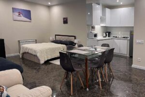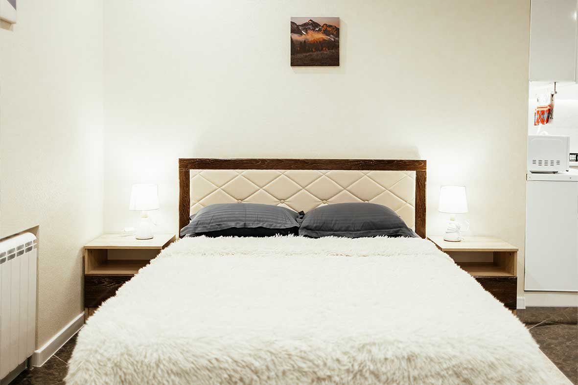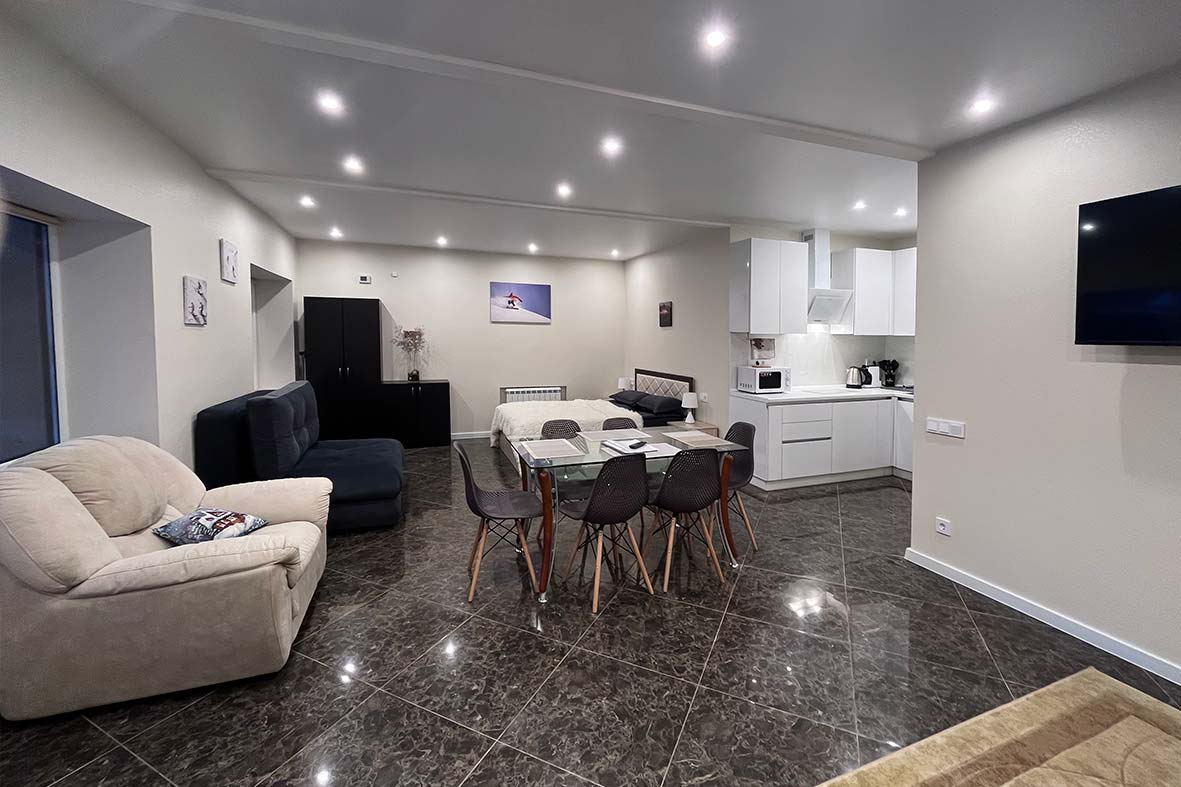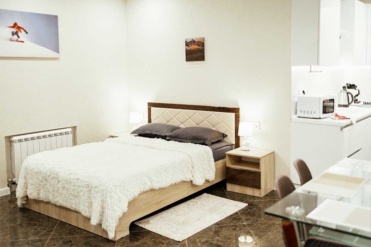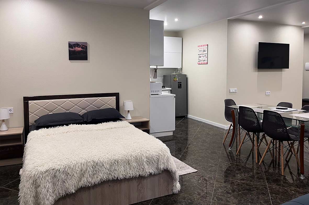 Квартира представляет собой спальную, гостевую и кухонную зоны. Санузел оснащен душевой кабиной и унитазом. В спальной зоне установлена двуспальная кровать, в гостевой зоне – два раскладных дивана и телевизор.