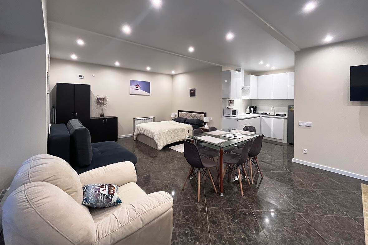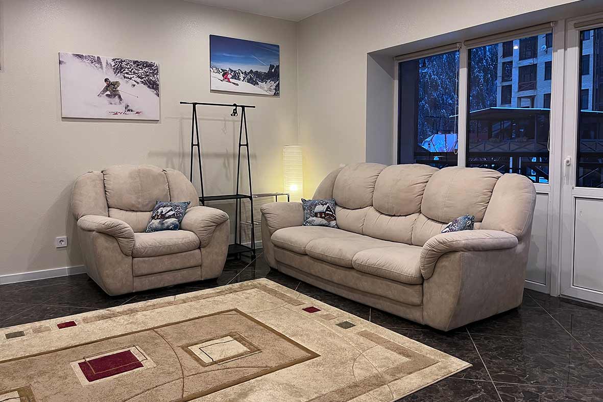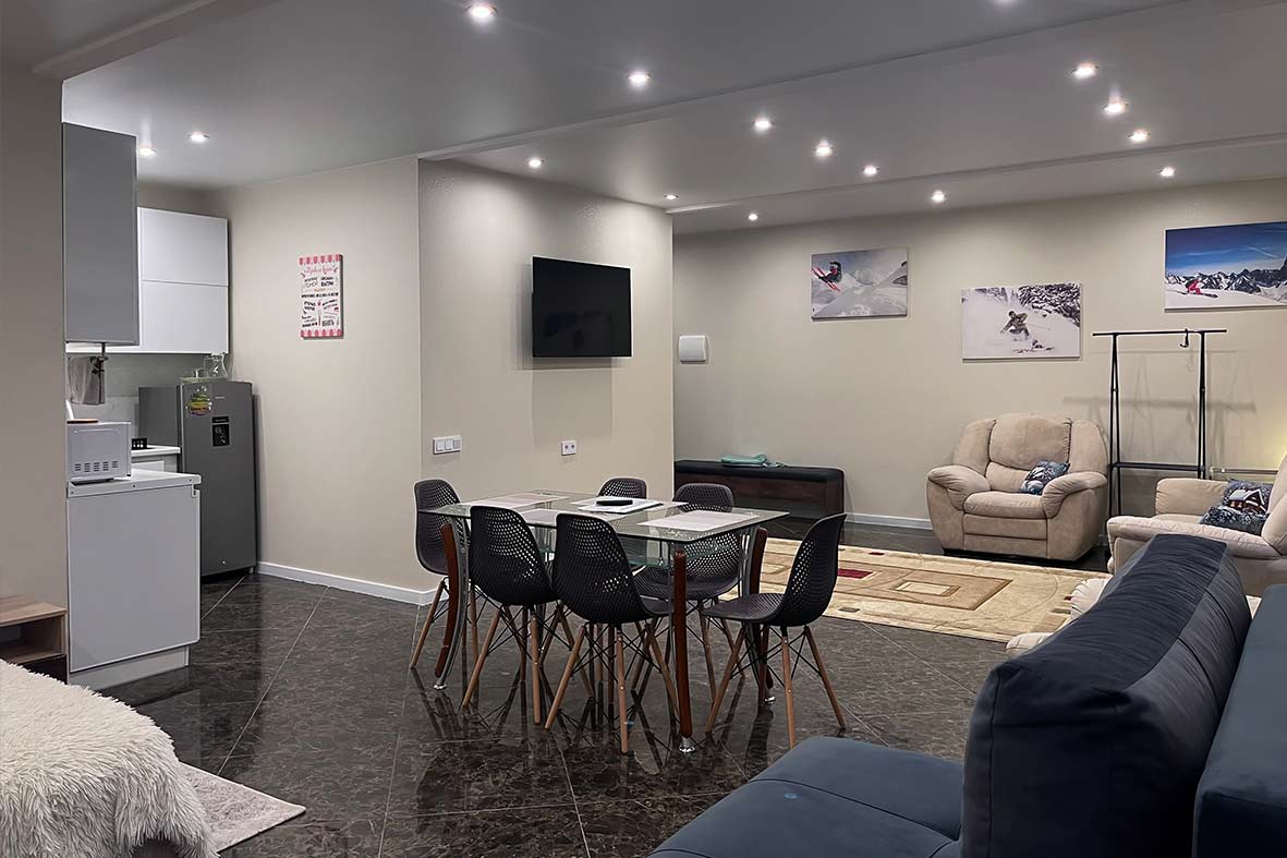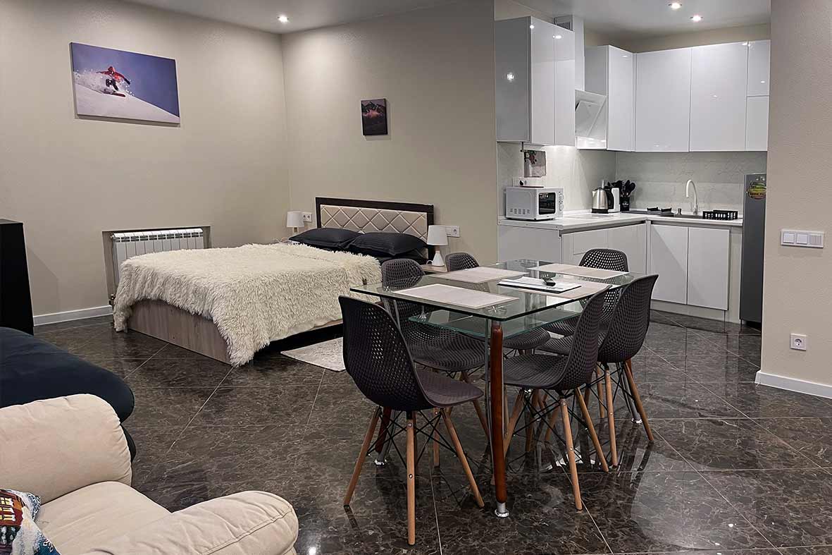 В проживание в данной квартиры включено посещение бассейна Dombay SKI&SPA на -1этаже. Вас ждет теплый плавательный бассейн, малый бассейн с морской водой, и гидротермальная зона с аквагейзером. Также гостям предоставляется бесплатная парковка на один автомобиль.
