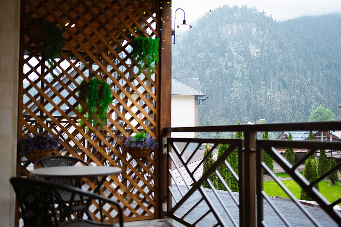 Из квартиры есть выход на террасу, с которой открывается вид на горы и канатную дорогу.