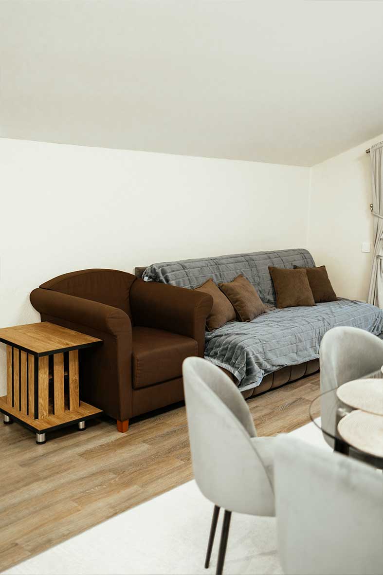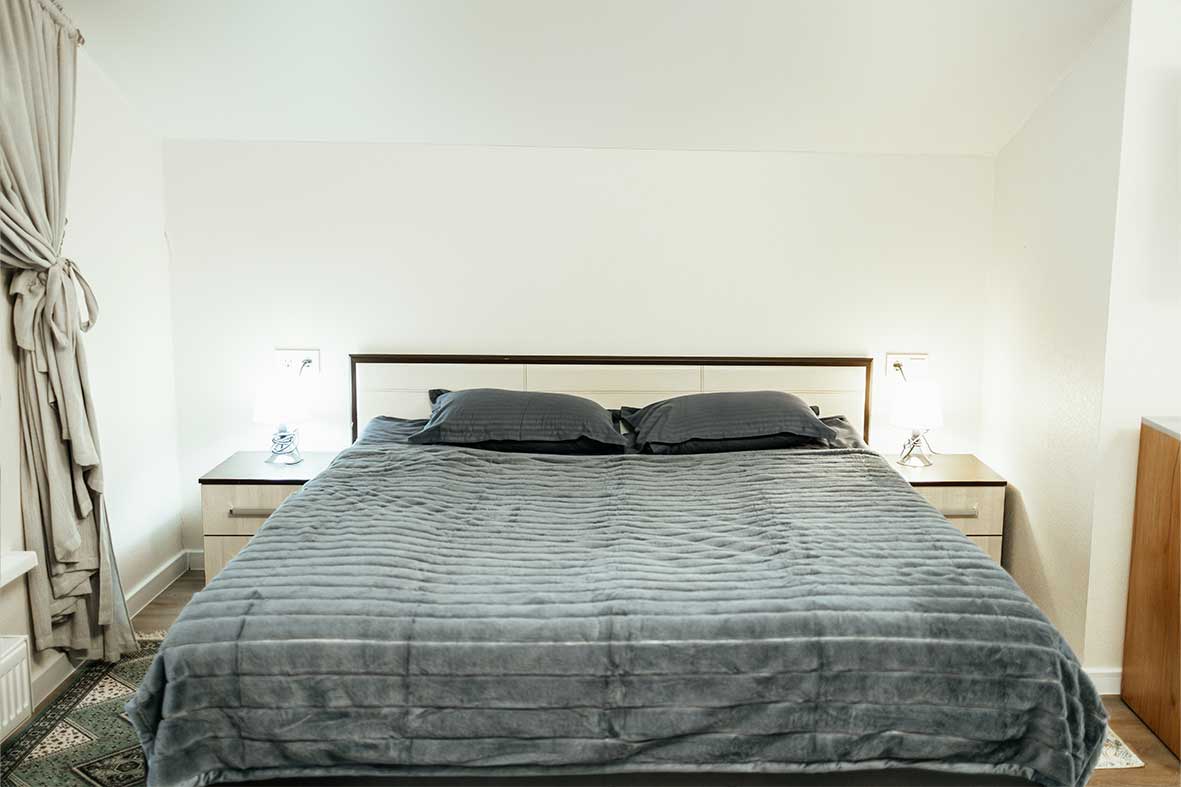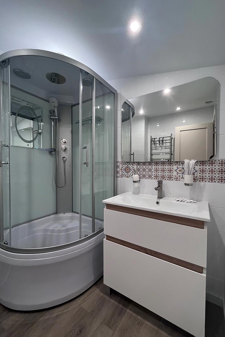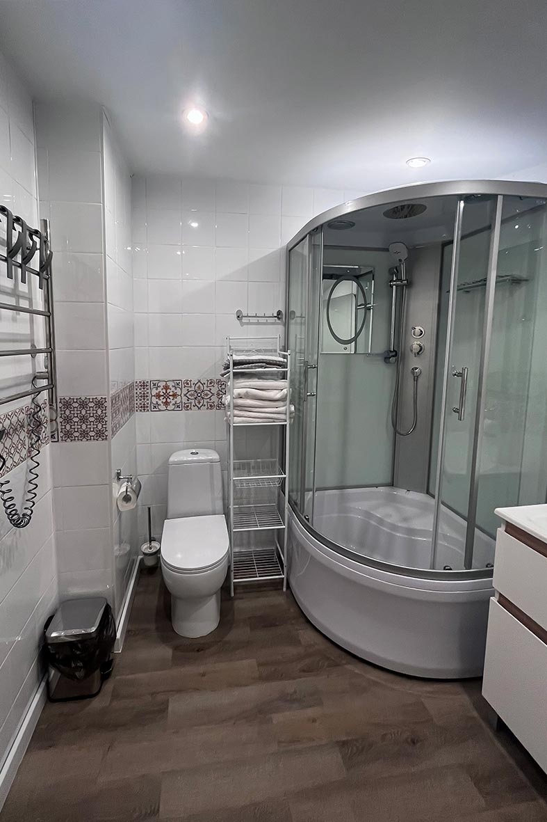 Квартира представляет собой спальную, гостевую и кухонную зоны. Санузел оснащен душевой кабиной и унитазом. В спальной зоне установлена двуспальная кровать, в гостевой зоне – два раскладных дивана и телевизор.