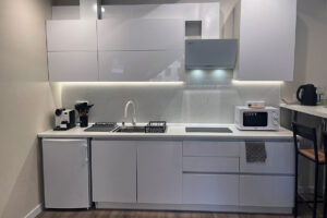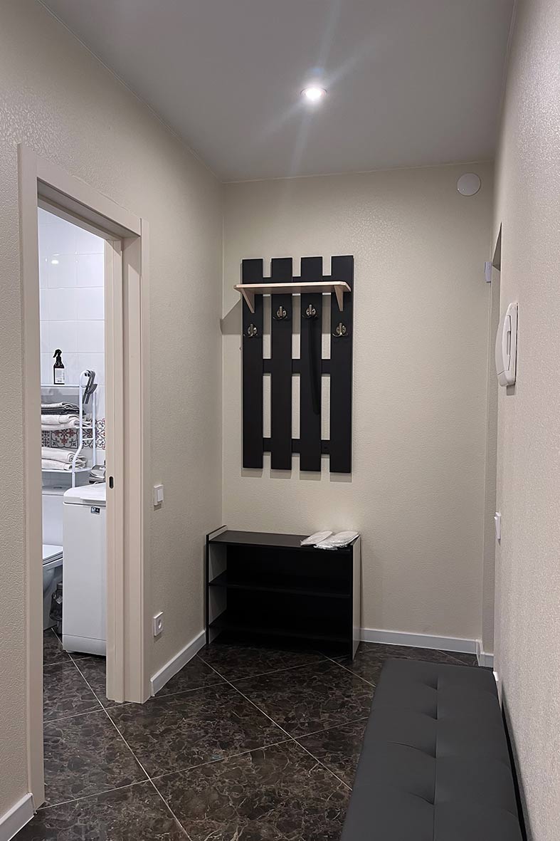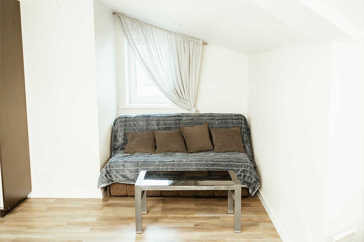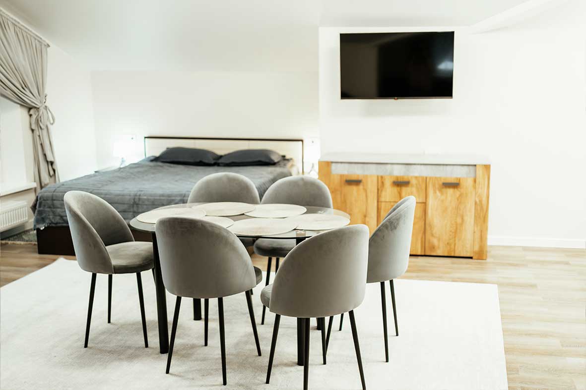 Квартира представляет собой спальную, гостевую и кухонную зоны. Санузел оснащен душевой кабиной и унитазом. В спальной зоне установлена двуспальная кровать, в гостевой зоне – два раскладных дивана и телевизор.