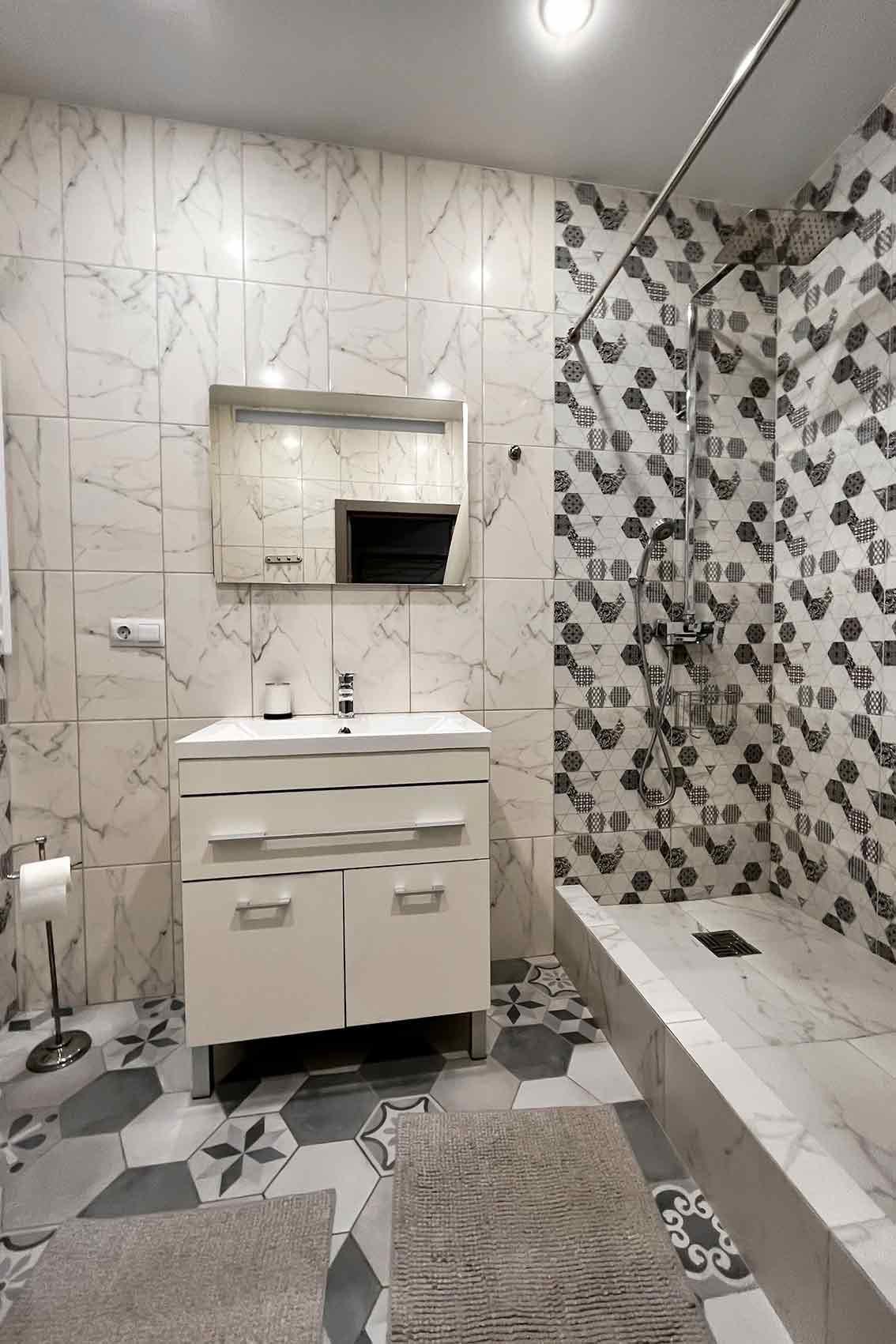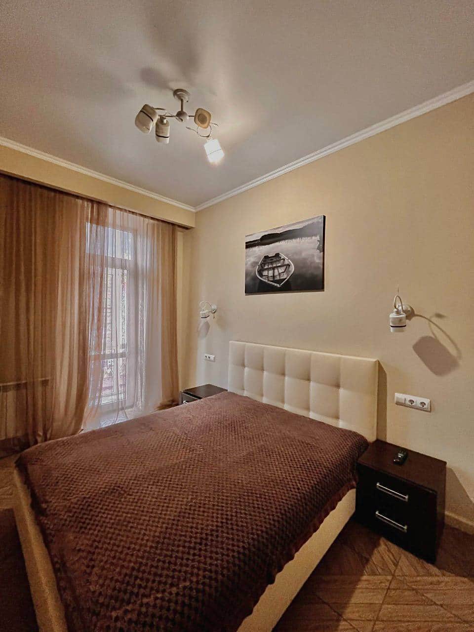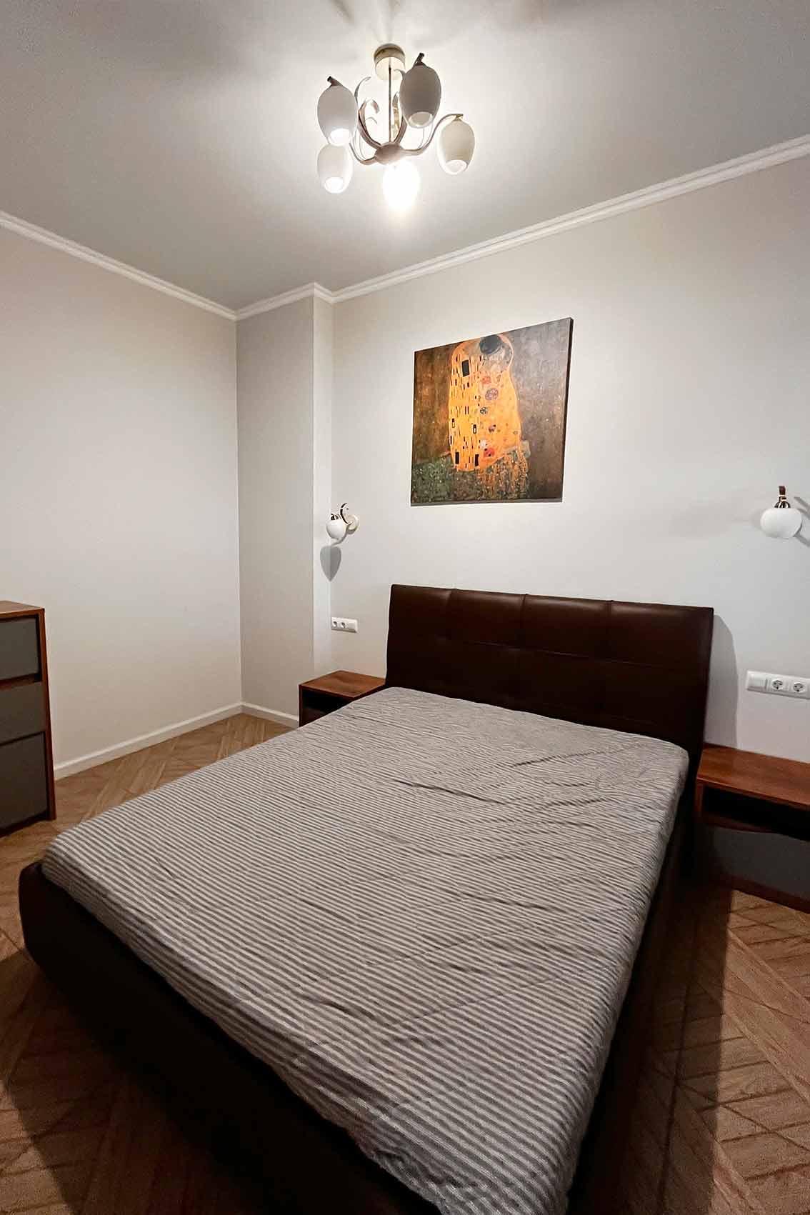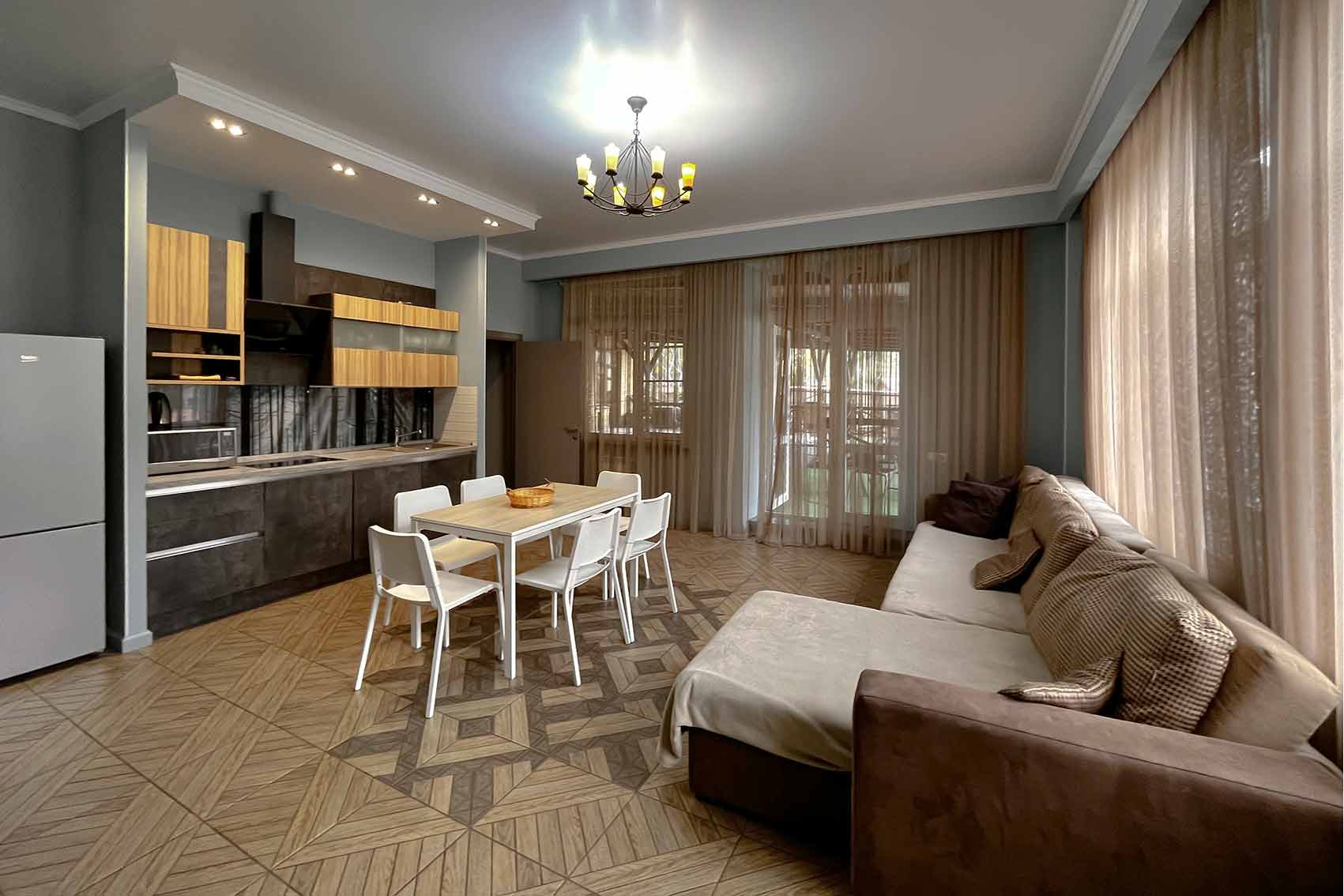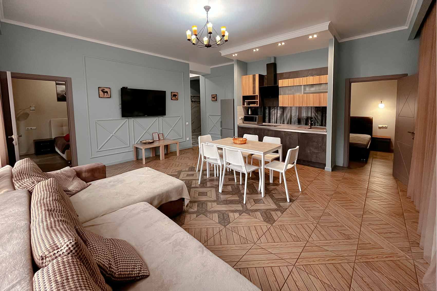 Квартира включает в себя гостевую зону с кухней, две изолированные спальни и ванную комнату с душем. В спальнях установлены двуспальные кровати, в гостевой зоне – два раскладных дивана. В квартире три телевизора, в спальнях и в гостиной.
