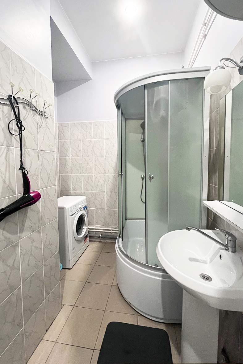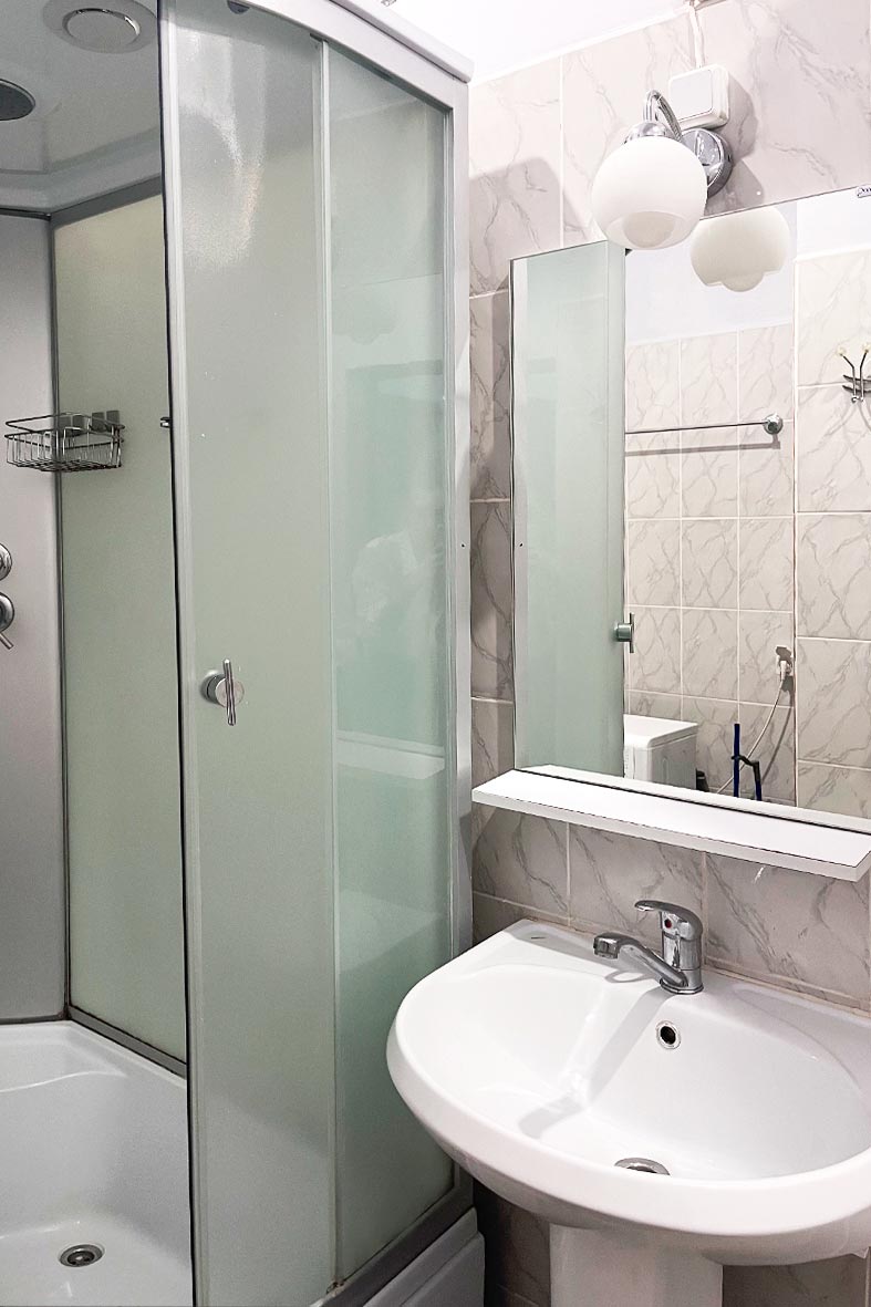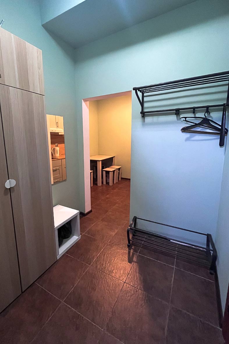 Квартира представляет собой небольшую кухню с обеденной зоной и комнату поделенную на спальную и гостевую зоны. Ванная комната оснащена душевой кабиной и унитазом. В спальной зоне установлены две односпальные кровати, в гостиной зоне – раскладной диван.
