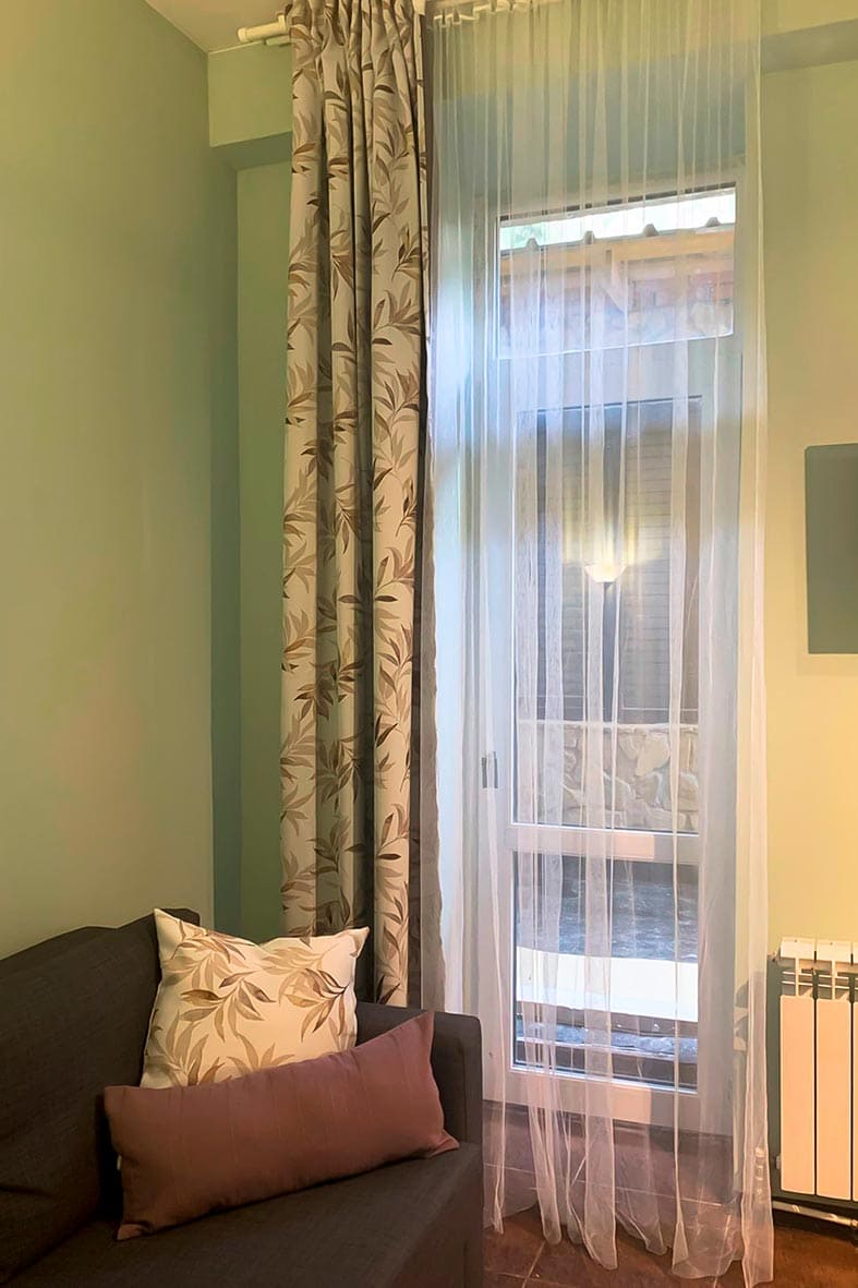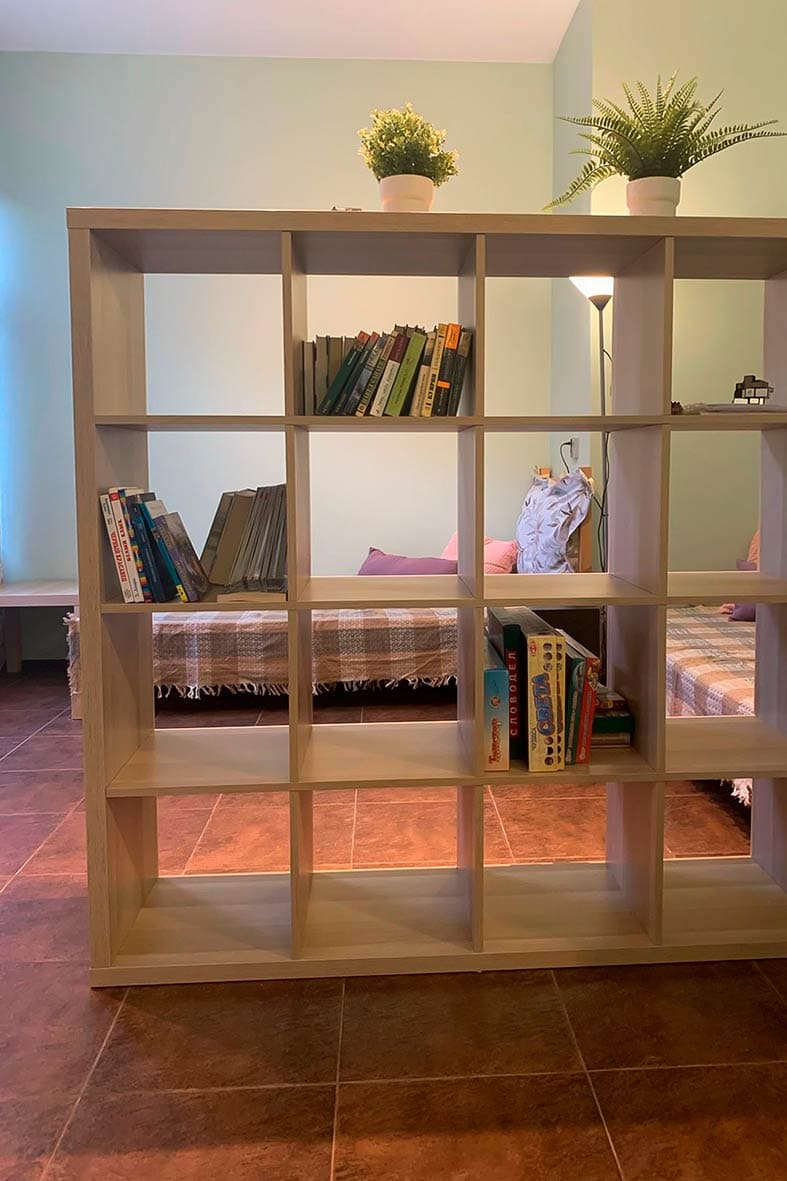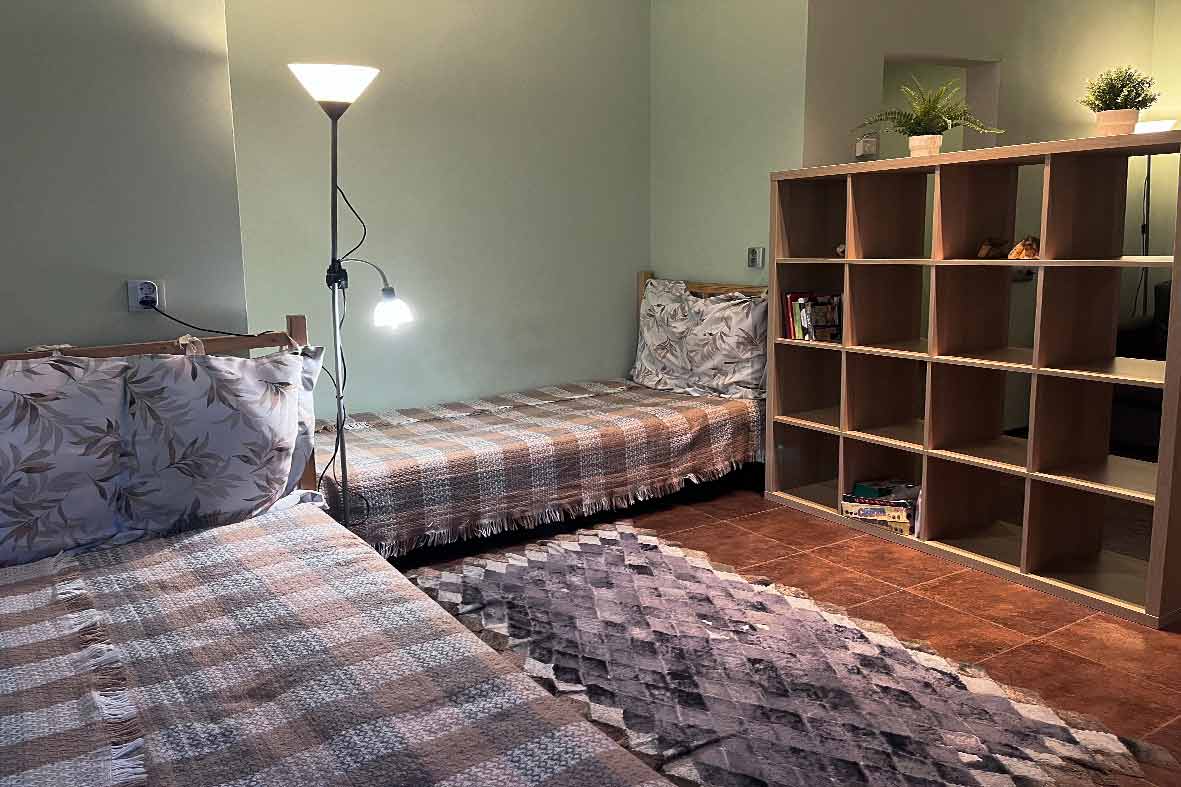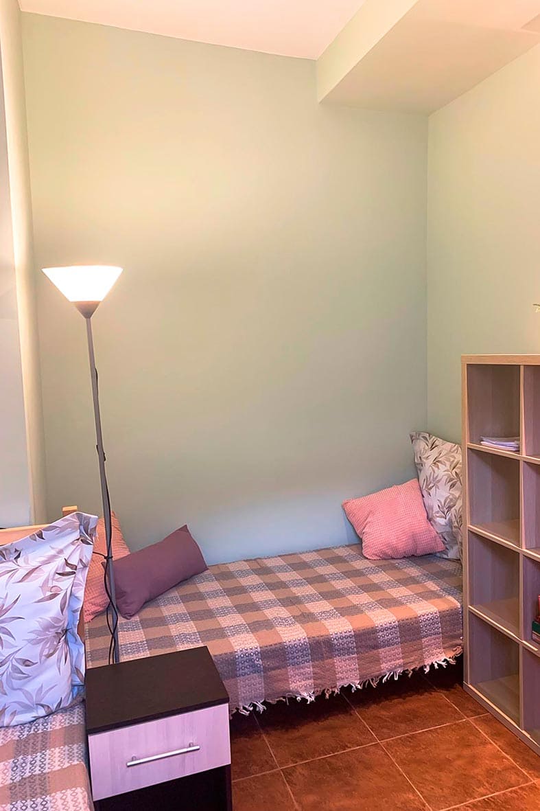 Квартира представляет собой небольшую кухню с обеденной зоной и комнату поделенную на спальную и гостевую зоны. Ванная комната оснащена душевой кабиной и унитазом. В спальной зоне установлены две односпальные кровати, в гостиной зоне – раскладной диван.