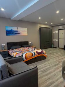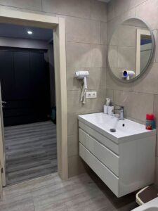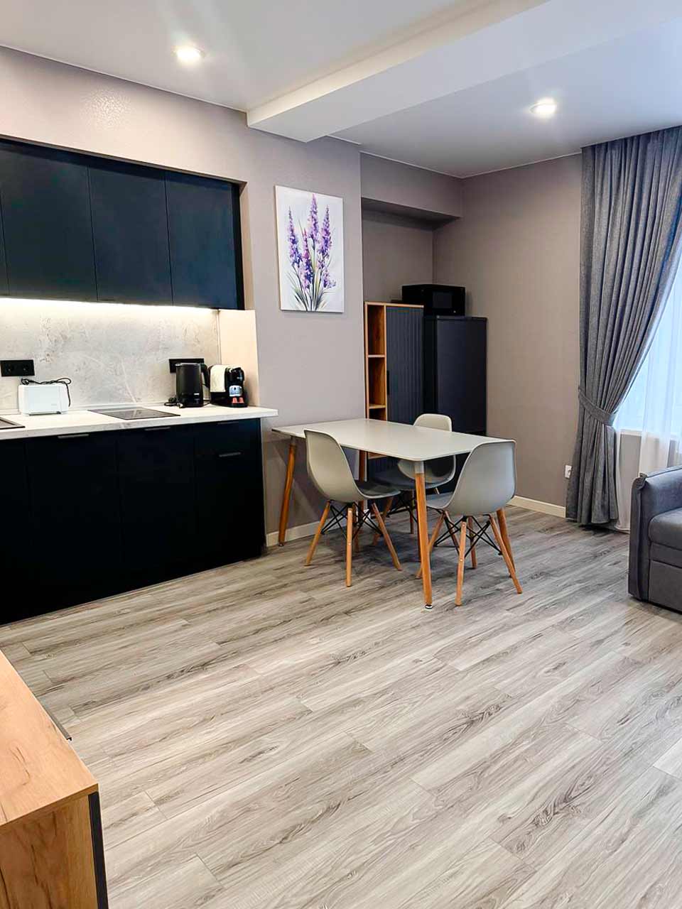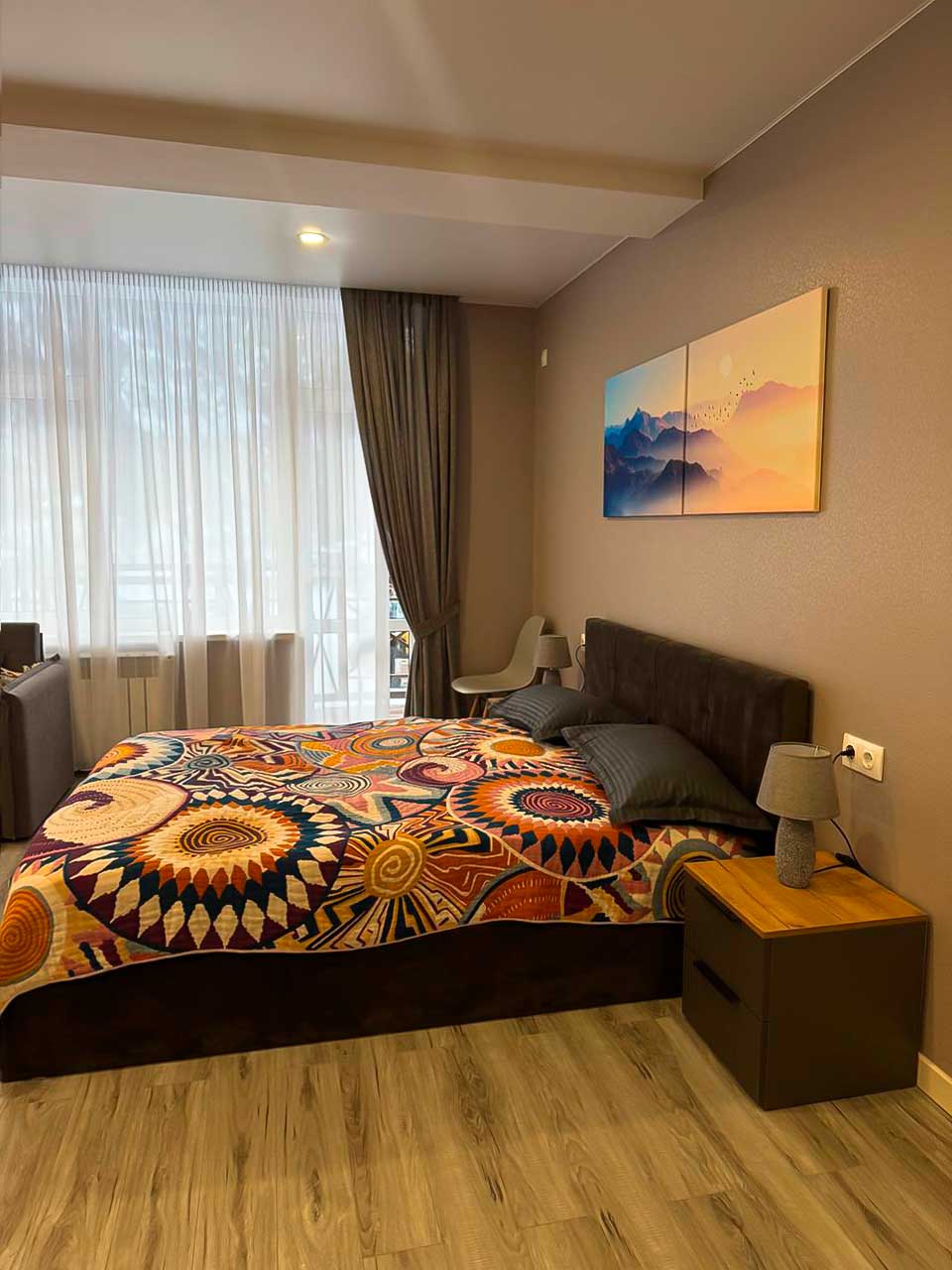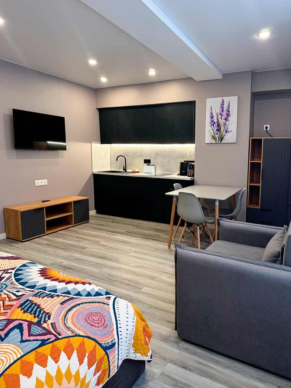 Квартира-студия включает в себя спальную и кухонную зоны и санузел. В спальной зоне установлена двуспальная кровать и телевизор. В санузле находится душевая кабина и унитаз.