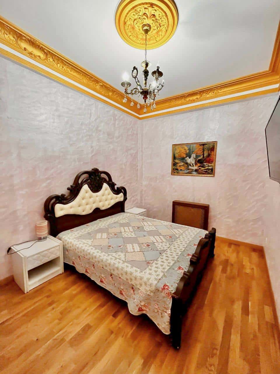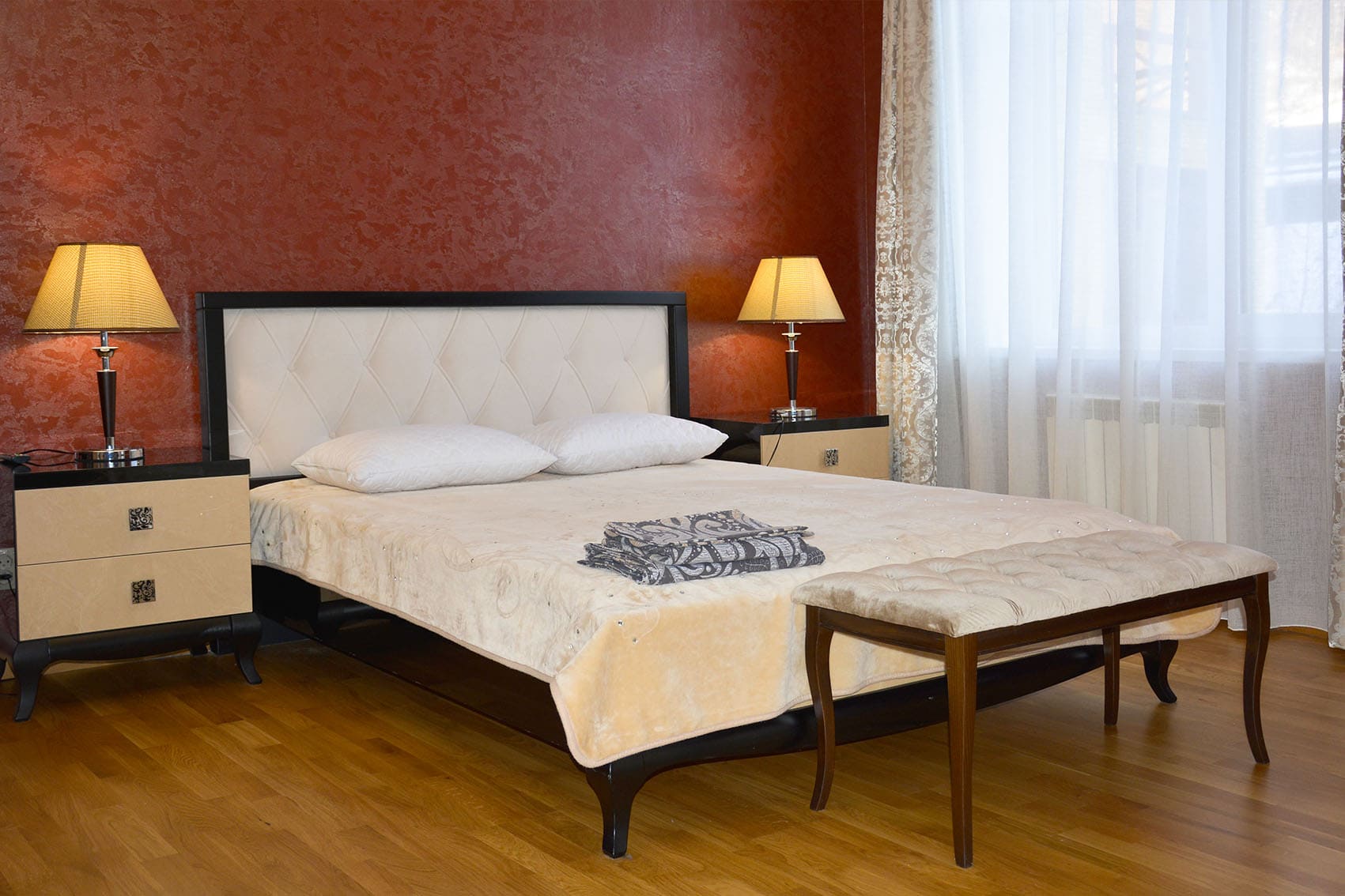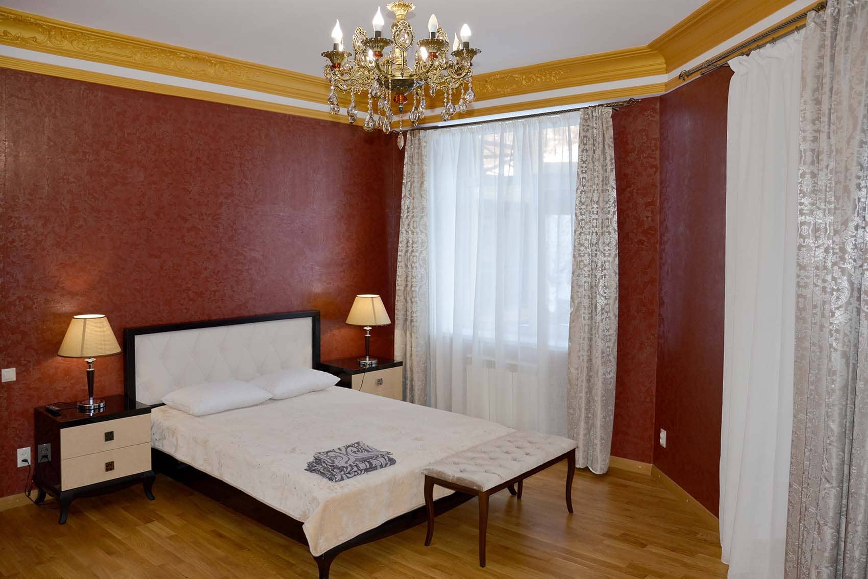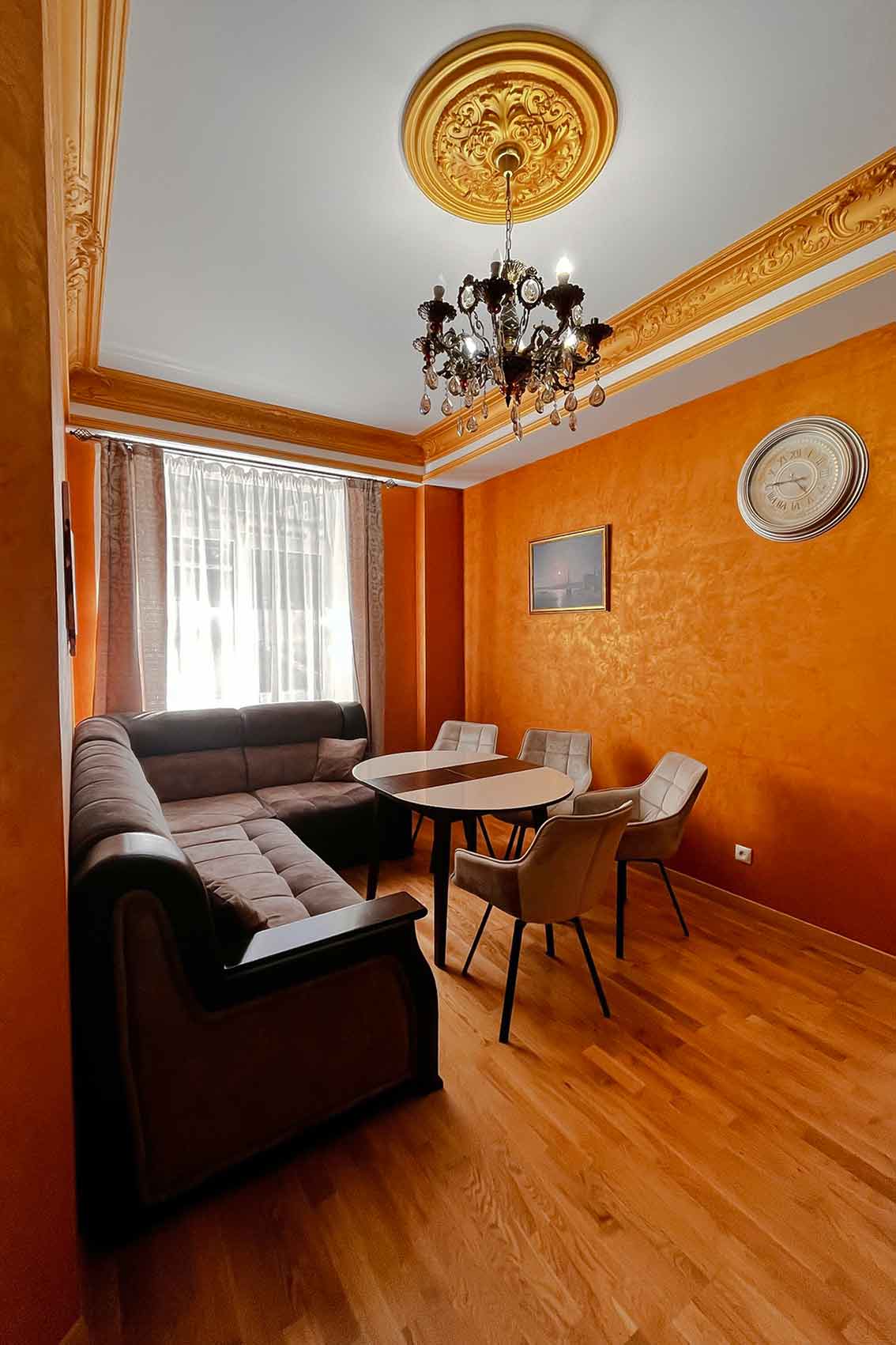 Квартира состоит из гостевой зоны с кухней, двух изолированных спален и ванной комнаты с джакузи. В обеих спальнях установлены двуспальные кровати и телевизоры. В просторной спальне есть большой комфортный диван и балкон, из панорамных окон которого, открывается вид на горы и канатную дорогу. В гостевой зоне установлен мягкий раскладной диван, обеденная зона и телевизор.