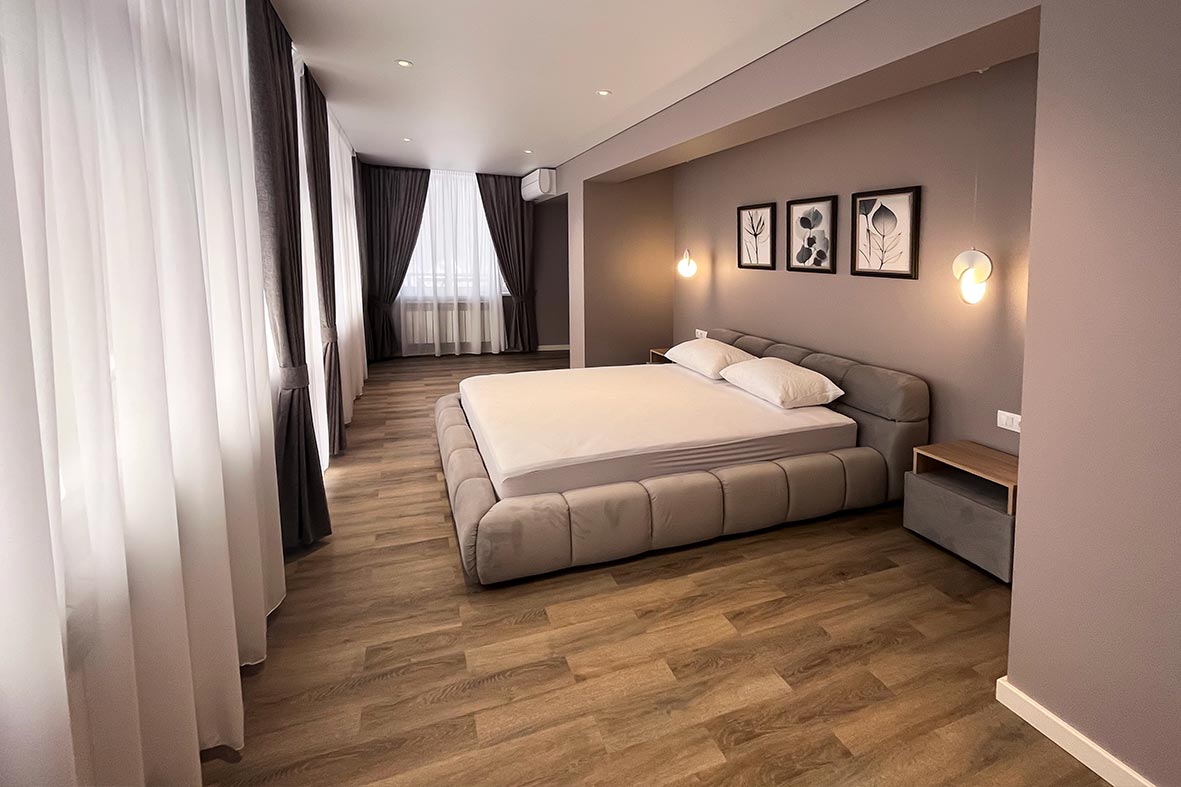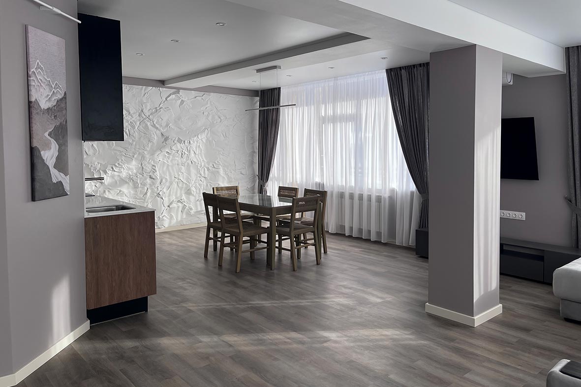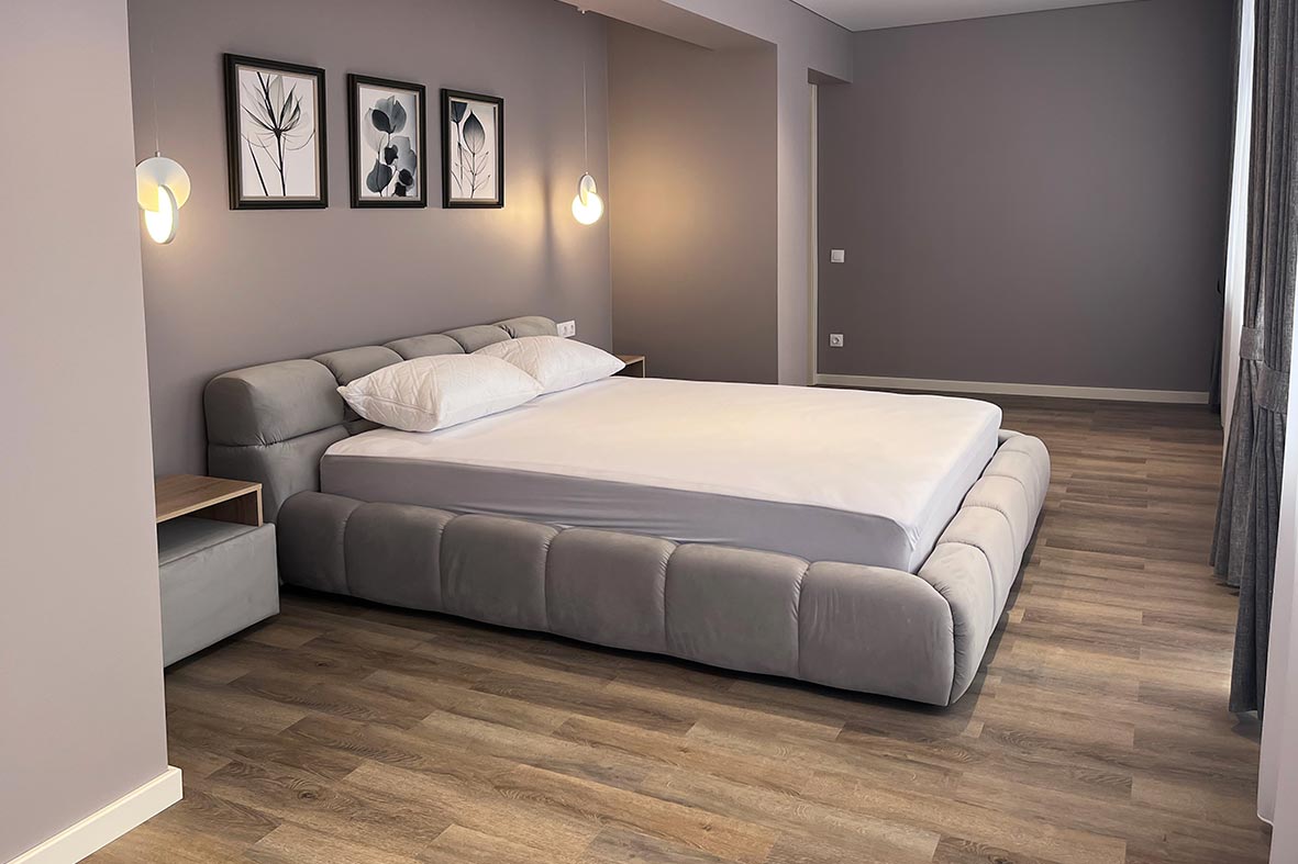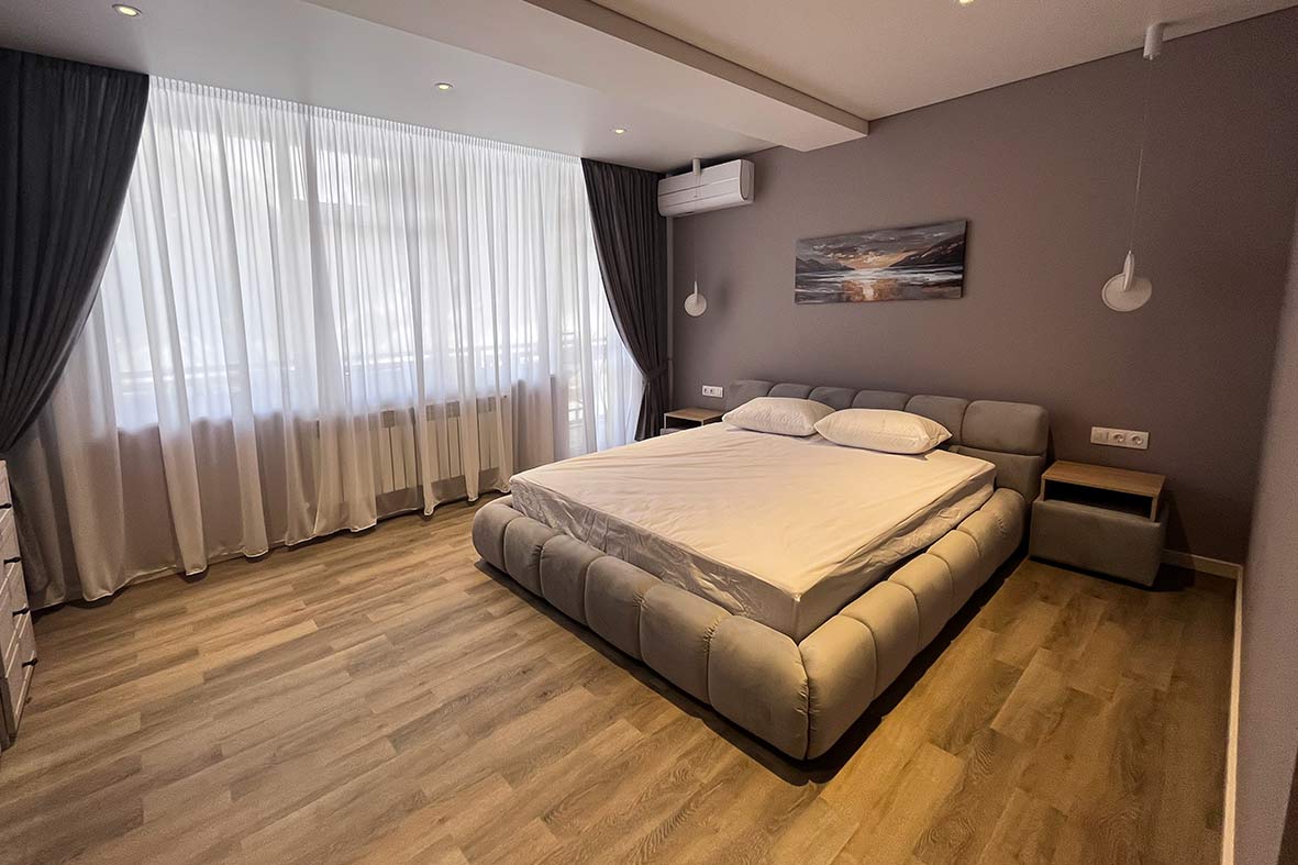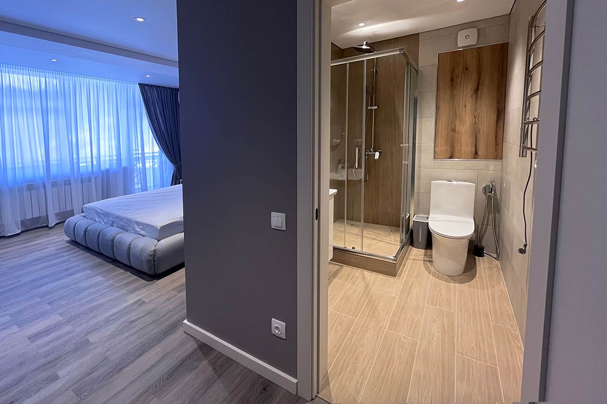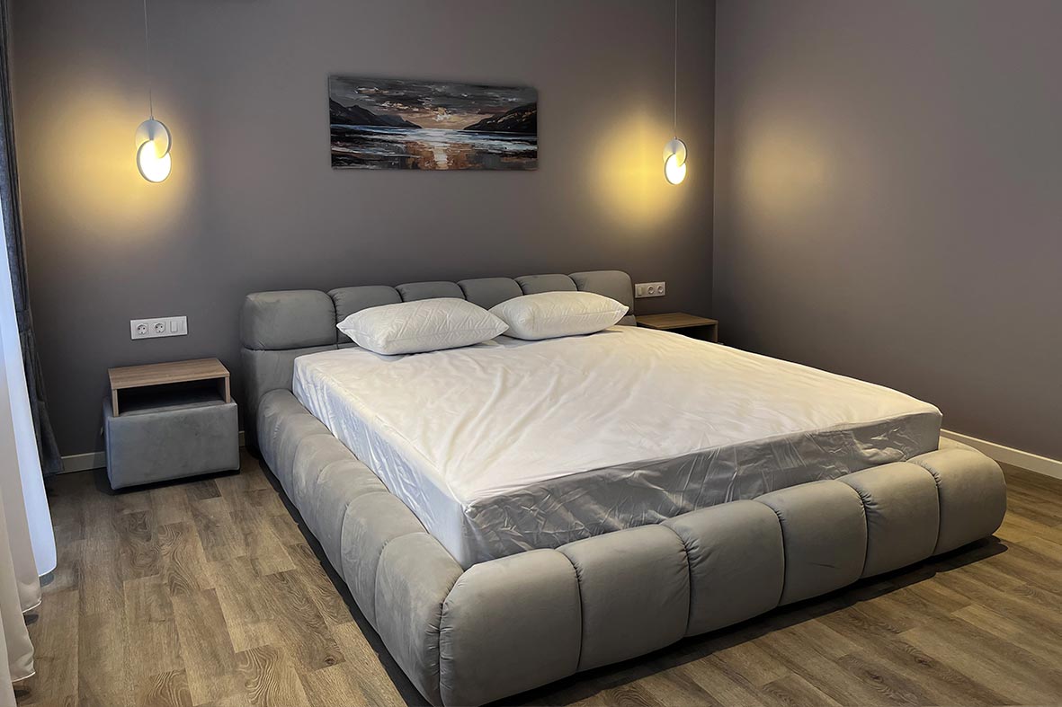 Квартира включает в себя просторную, светлую гостиную с кухней, две изолированные спальни и два санузла. Один санузел примыкает к спальне, другой расположен в коридоре. В каждом санузле находится душевая кабина и унитаз. В спальнях установлены двуспальные кровати, в гостевой зоне –раскладной диван. В каждой комнате есть телевизор.
