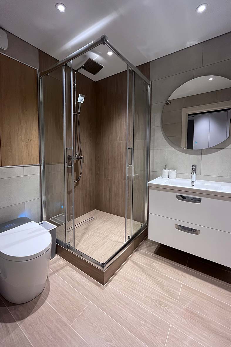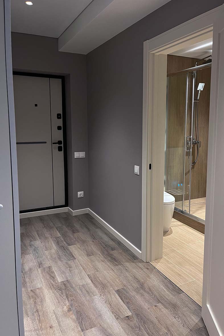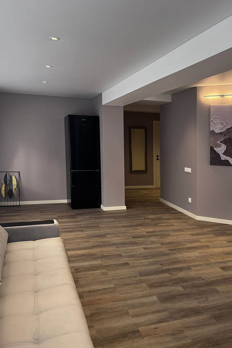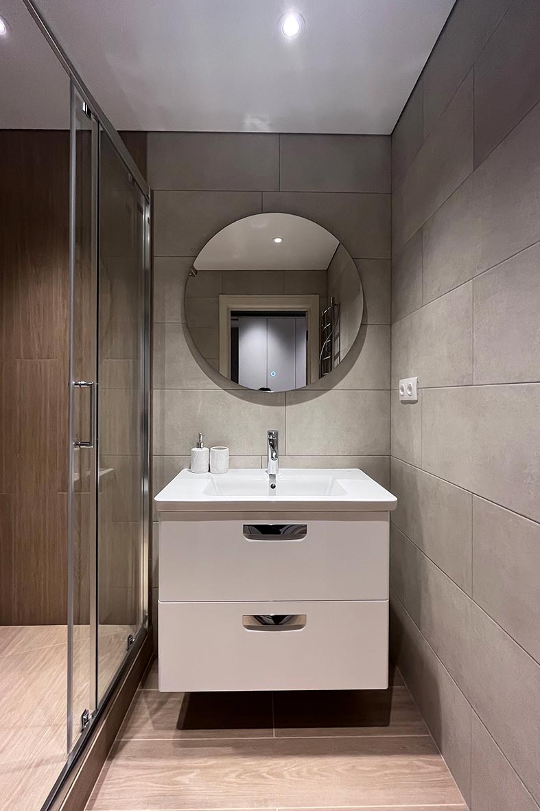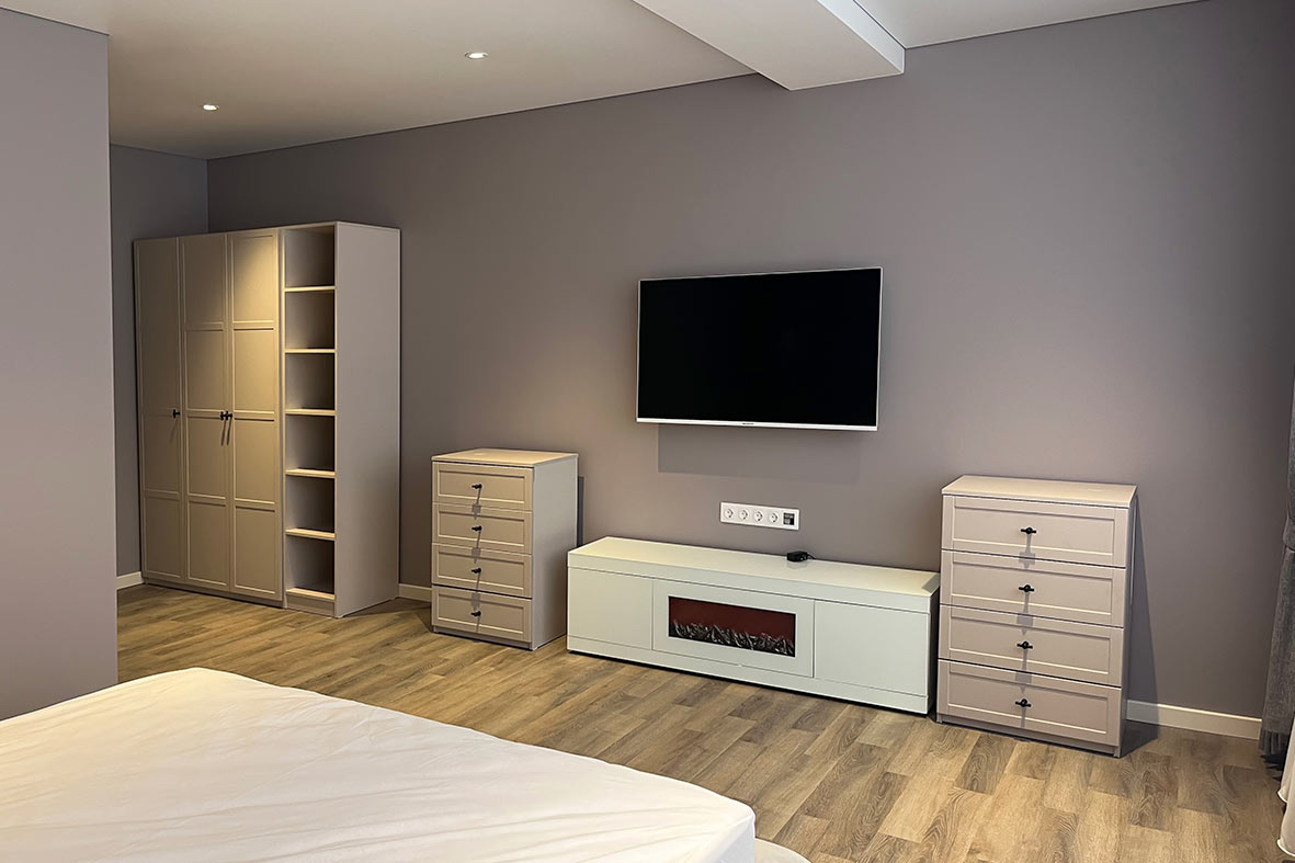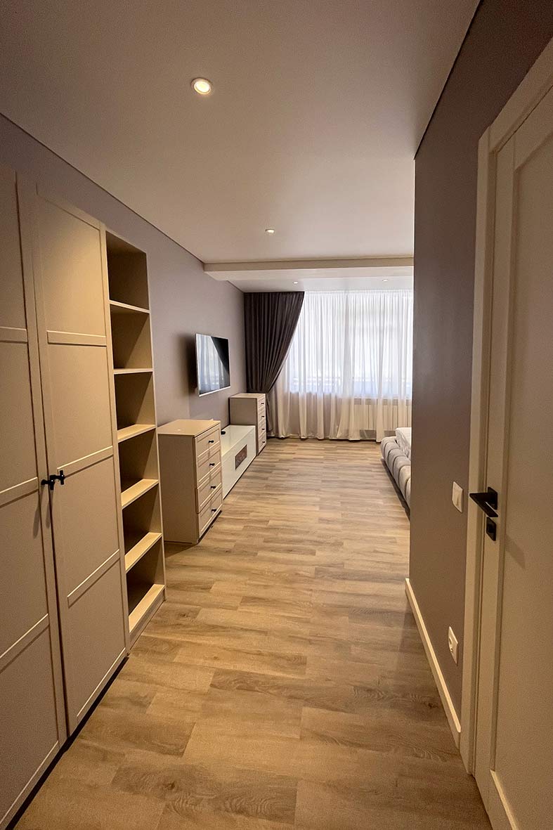 Квартира включает в себя просторную, светлую гостиную с кухней, две изолированные спальни и два санузла. Один санузел примыкает к спальне, другой расположен в коридоре. В каждом санузле находится душевая кабина и унитаз. В спальнях установлены двуспальные кровати, в гостевой зоне –раскладной диван. В каждой комнате есть телевизор.