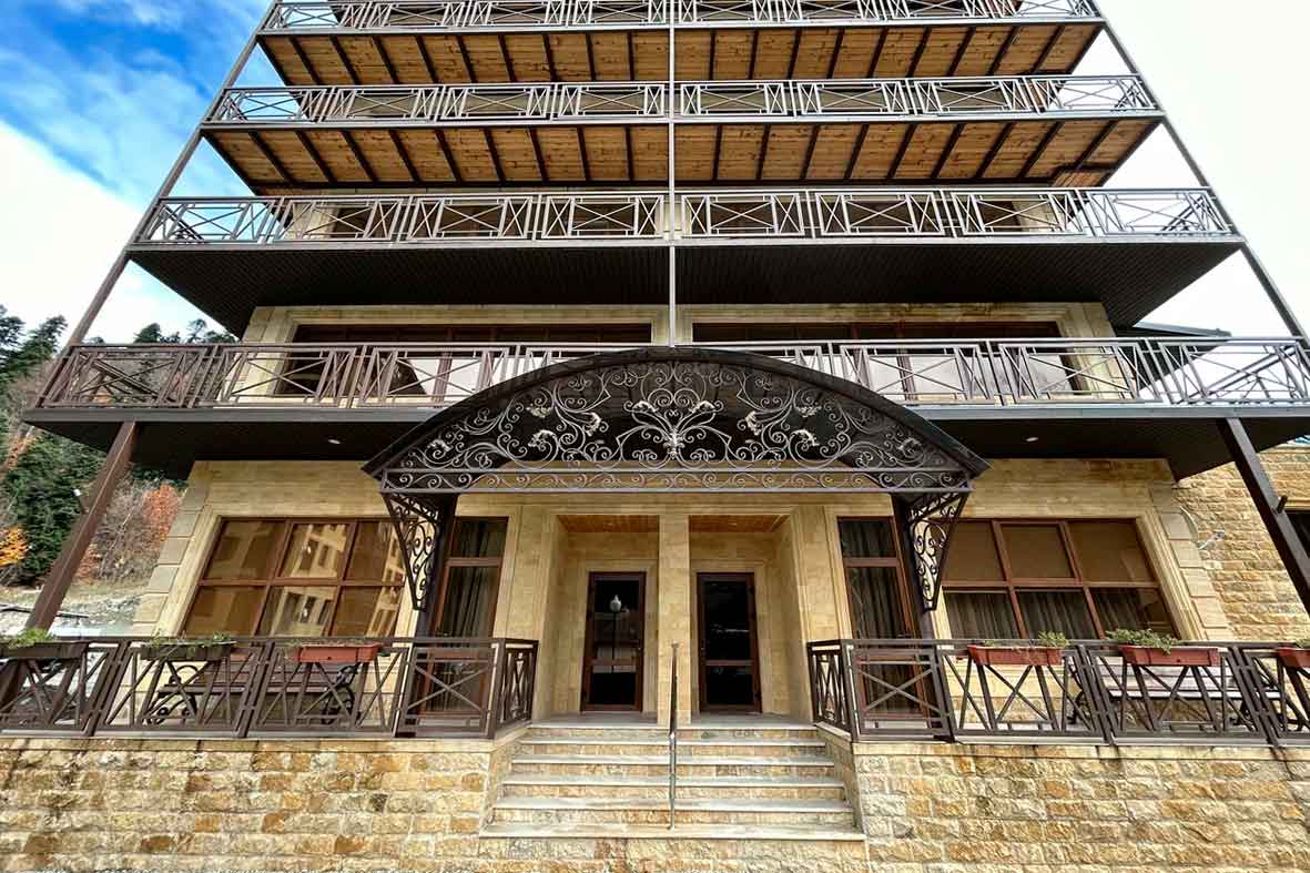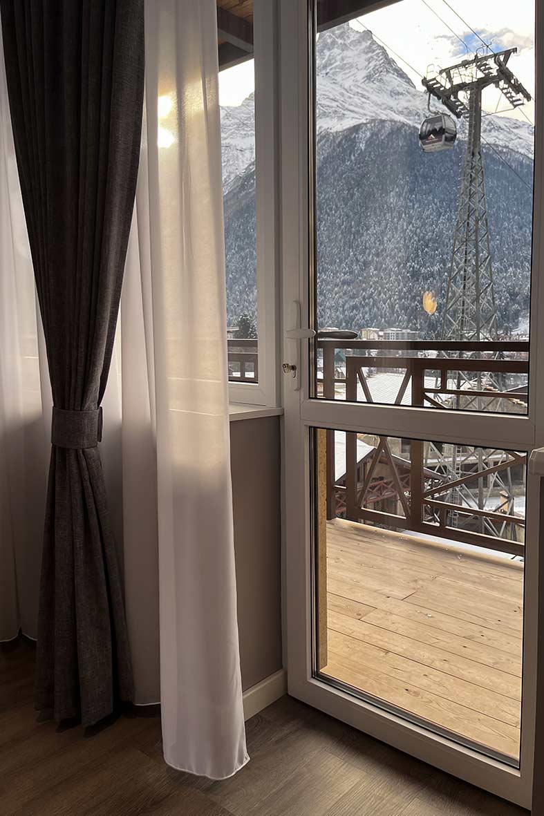 С балкона открывается впечатляющий вид на горы и на канатную дорогу.