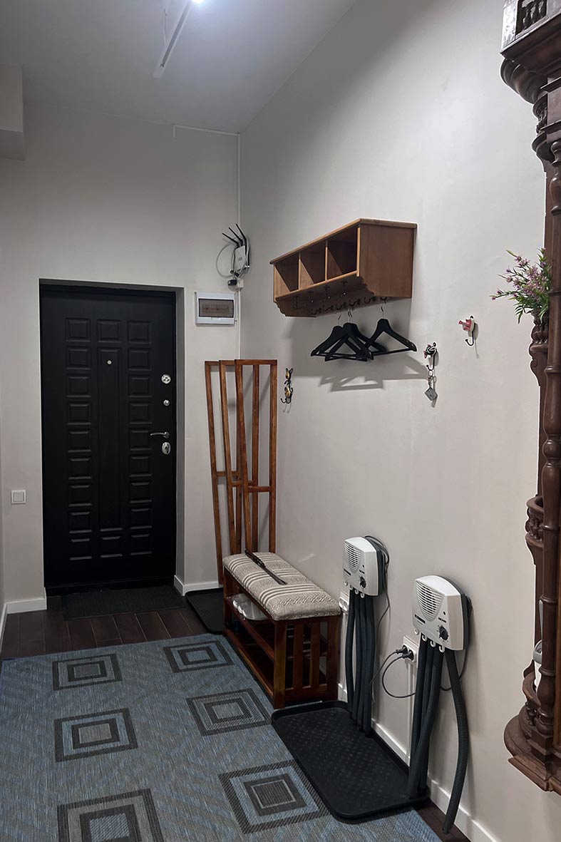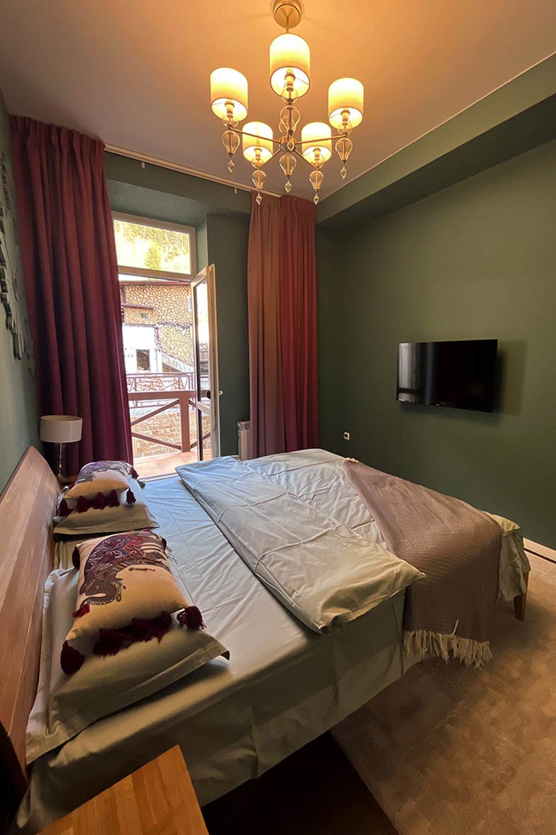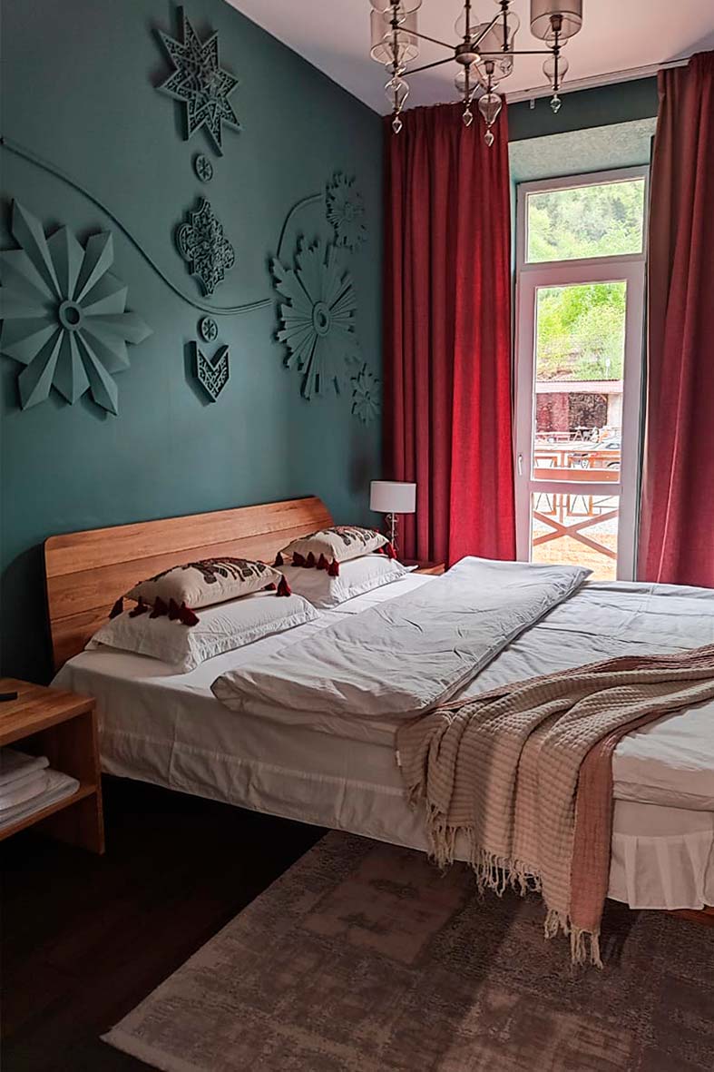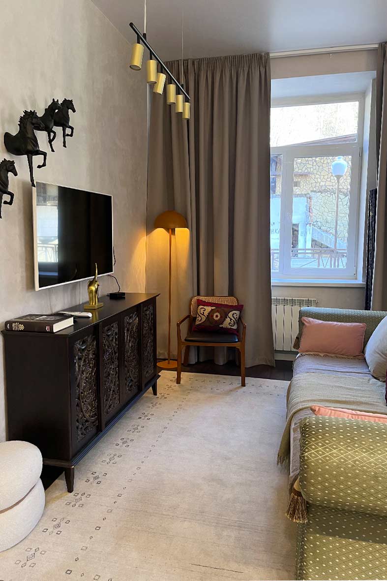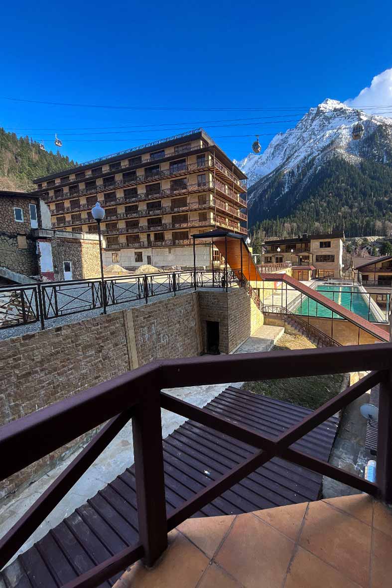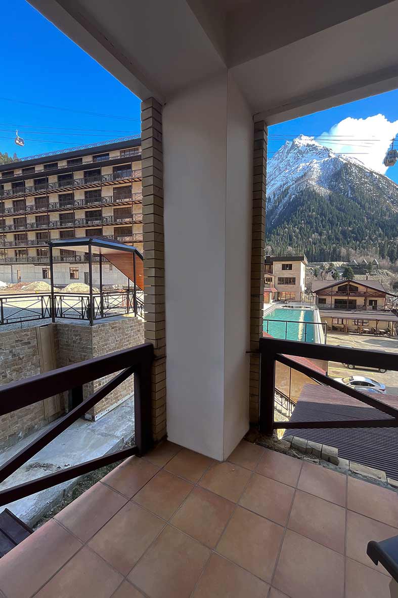 С балкона открывается завораживающий вид на горы и на канатную дорогу. Вся мебель выполнена из массива дерева, металла и камня.