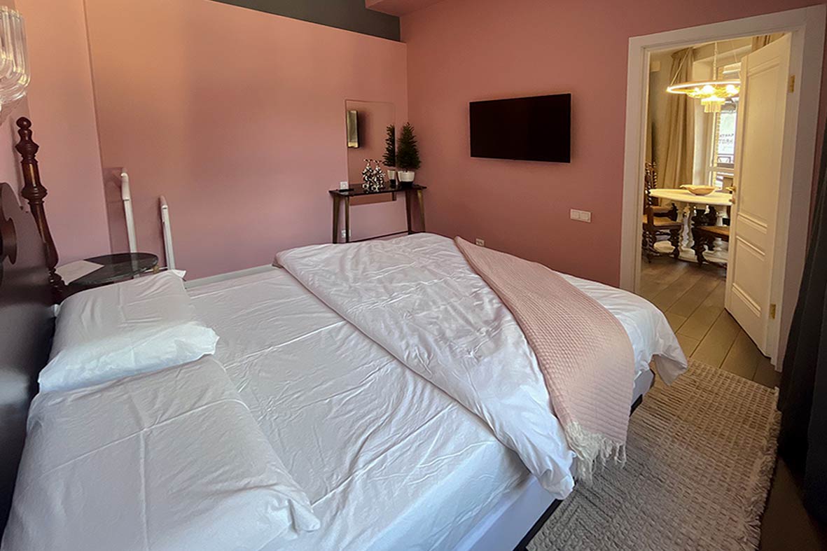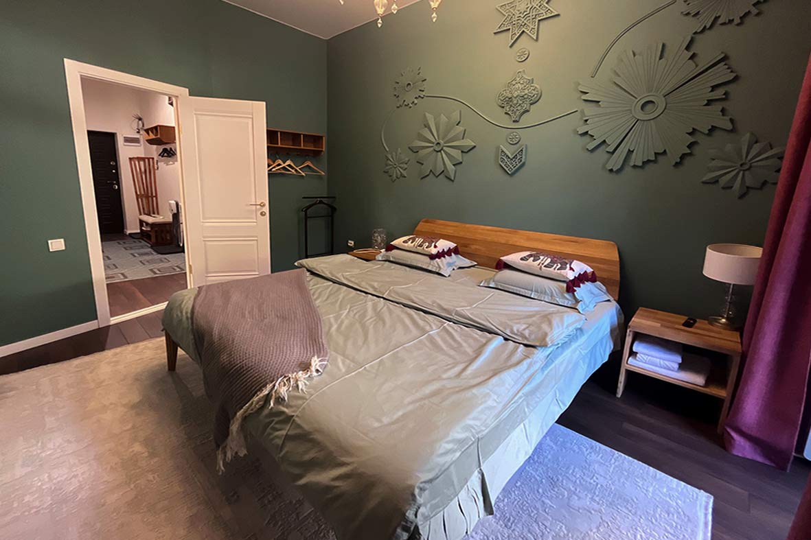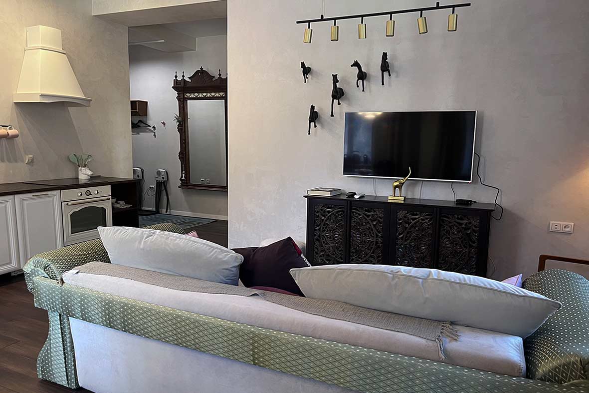 Квартира включает в себя гостиную с кухней, две изолированные спальни и ванную комнату. В спальнях установлены двуспальные кровати, в гостевой зоне – раскладной диван. Квартира оснащена тремя телевизорами.