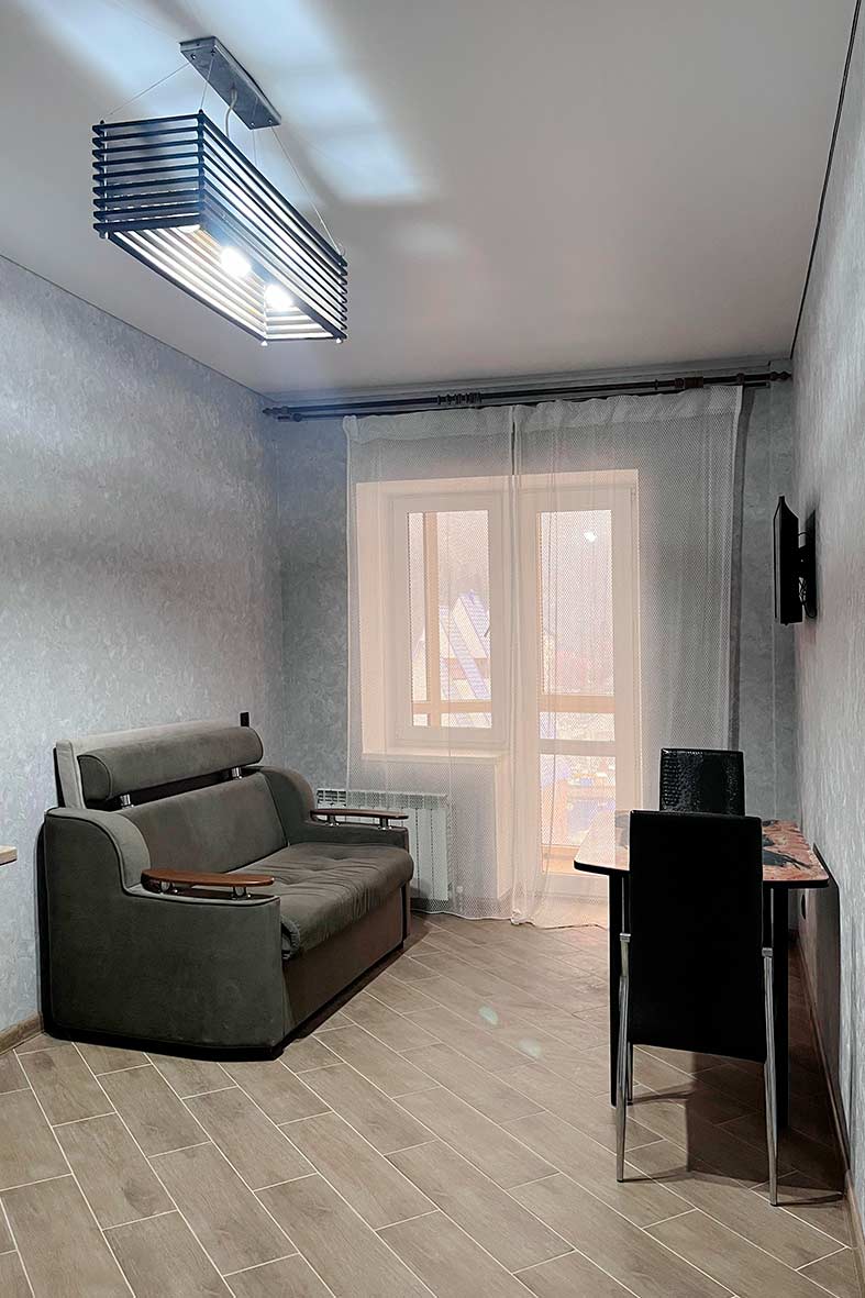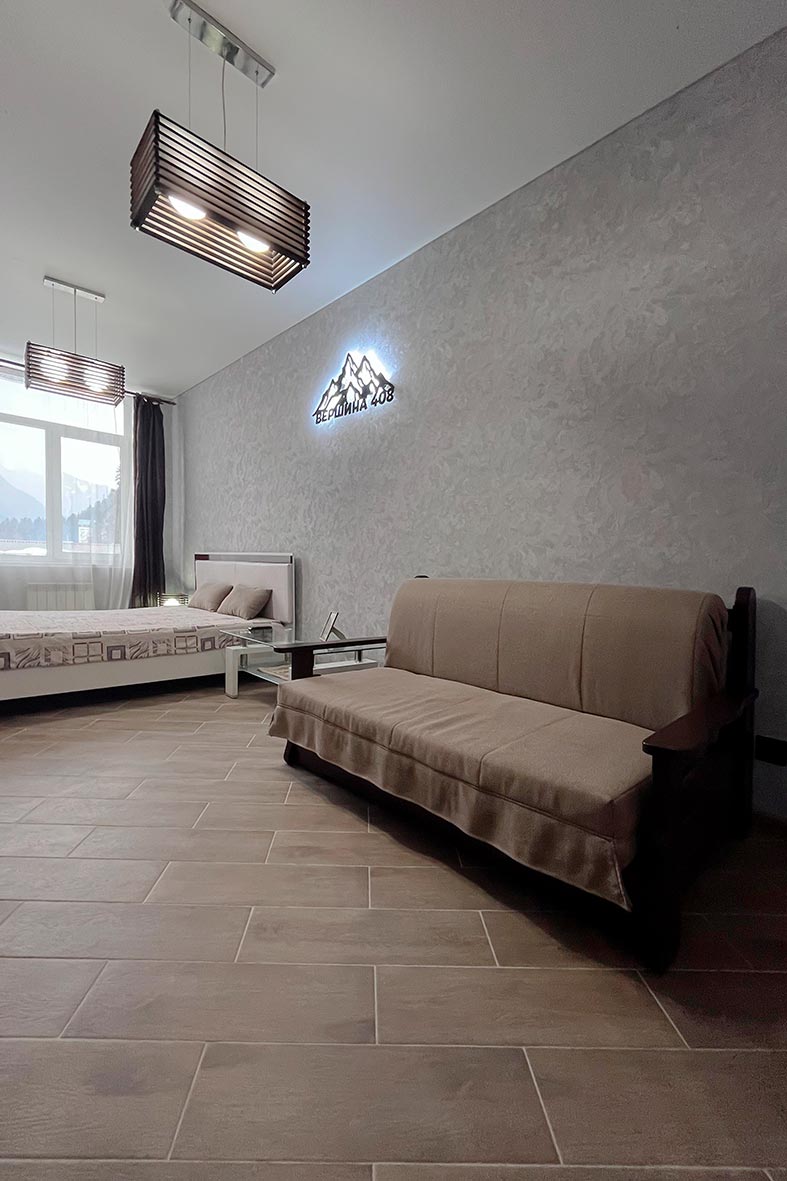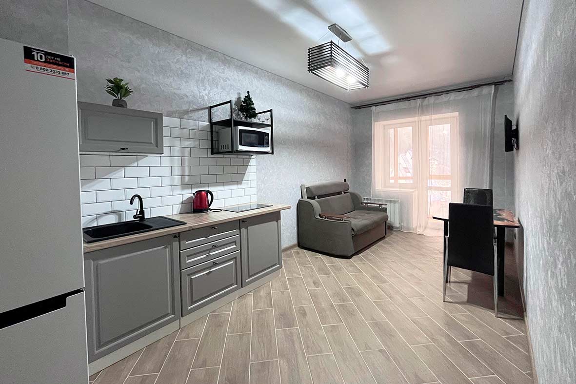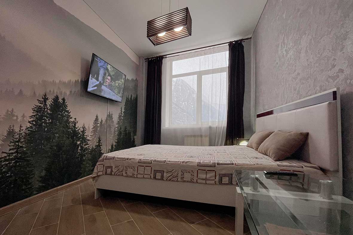 Квартира представляет собой две комнаты: гостиную совмещенную со спальней и изолированную кухню. Ванная комната оснащена душевой кабиной. В спальной зоне находится двуспальная кровать и телевизор, в гостиной зоне – раскладной диван. На кухне также расположен раскладной диван, обеденная зона и телевизор.