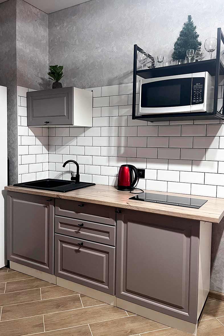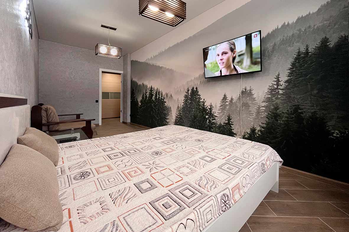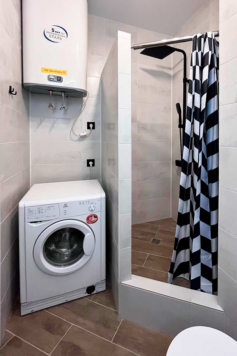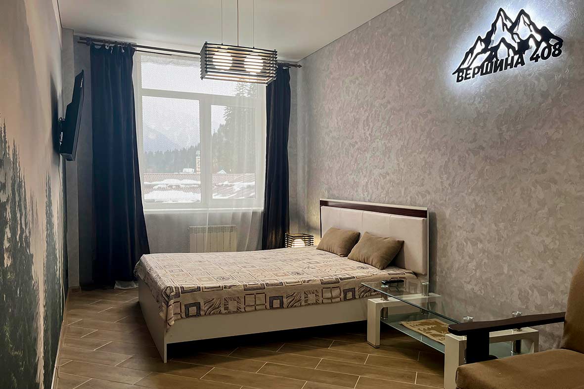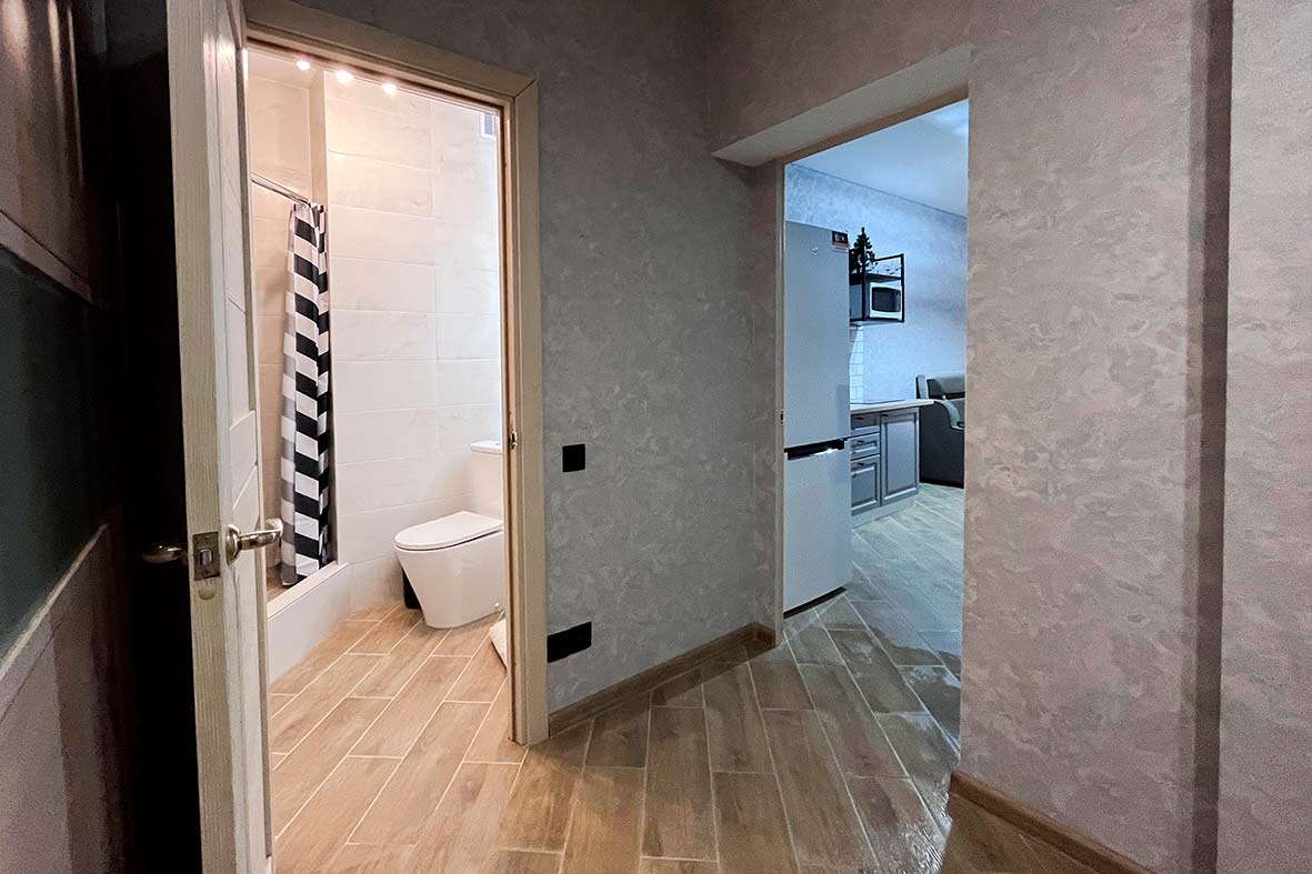 Квартира представляет собой две комнаты: гостиную совмещенную со спальней и изолированную кухню. Ванная комната оснащена душевой кабиной. В спальной зоне находится двуспальная кровать и телевизор, в гостиной зоне – раскладной диван. На кухне также расположен раскладной диван, обеденная зона и телевизор.