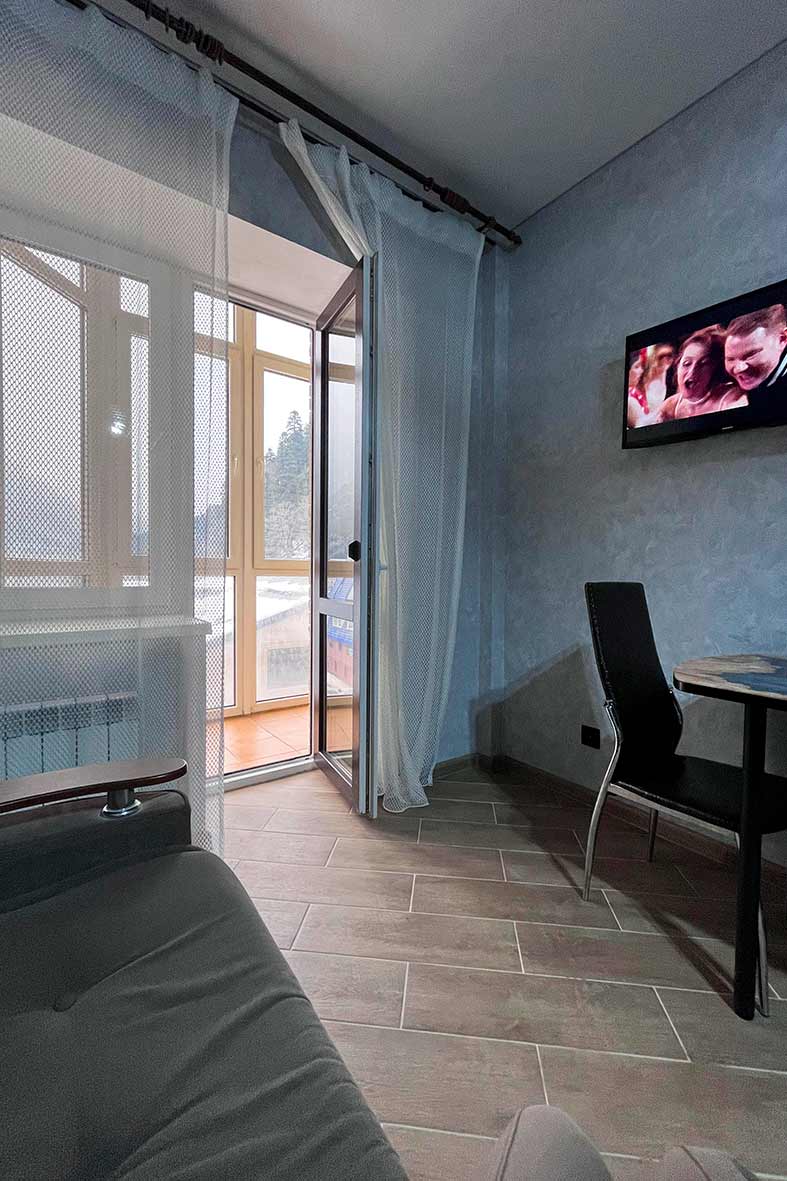 Из окон застекленного балкона видны горы и окрестности Домбая.