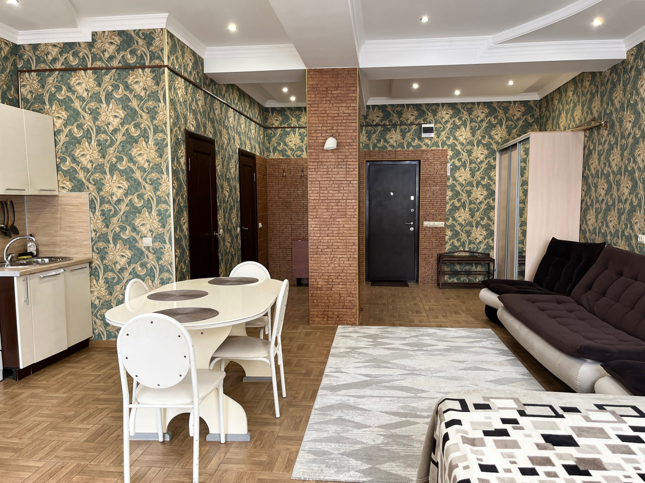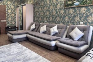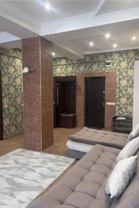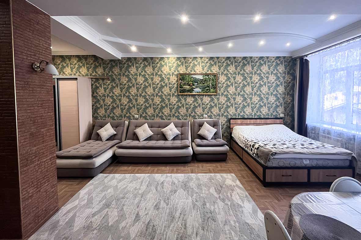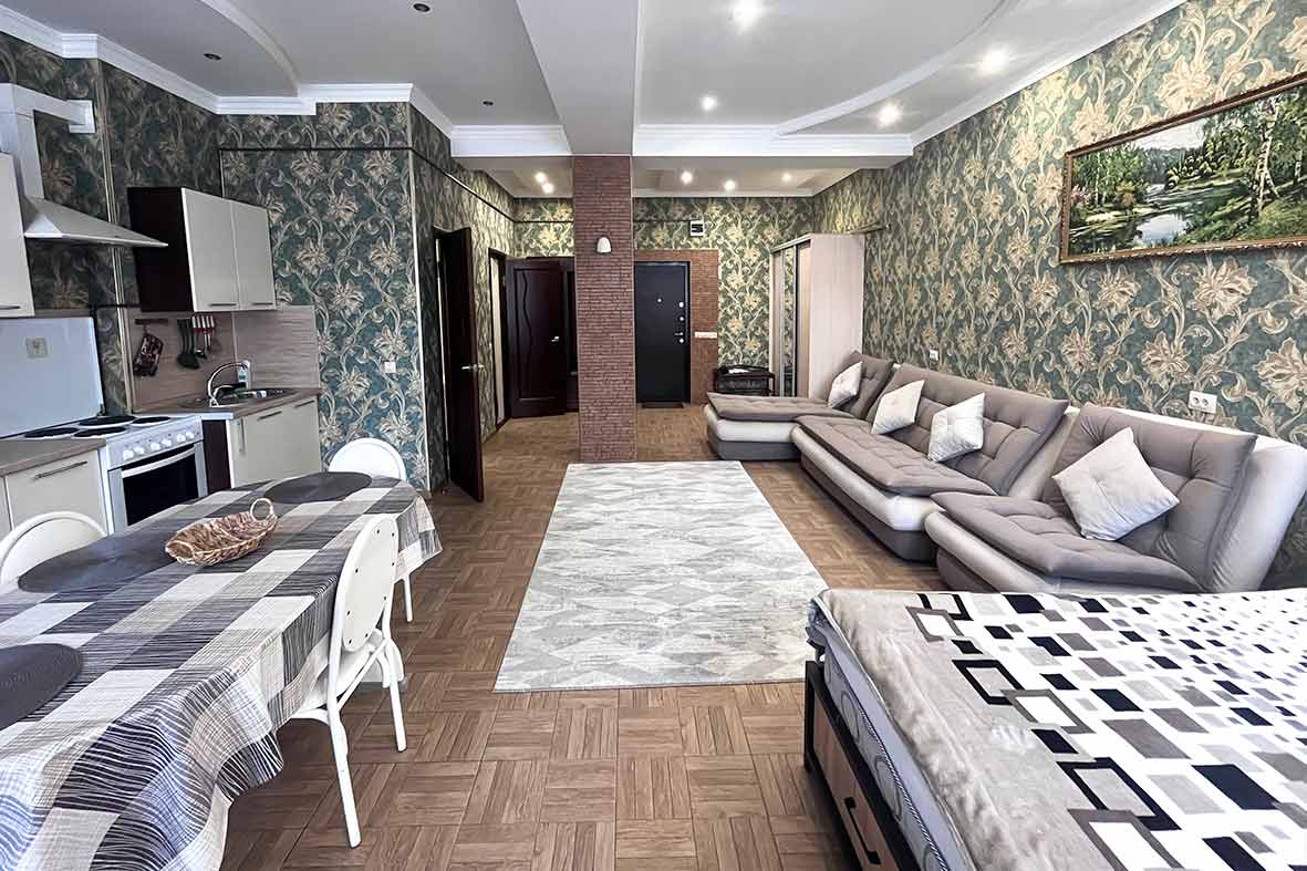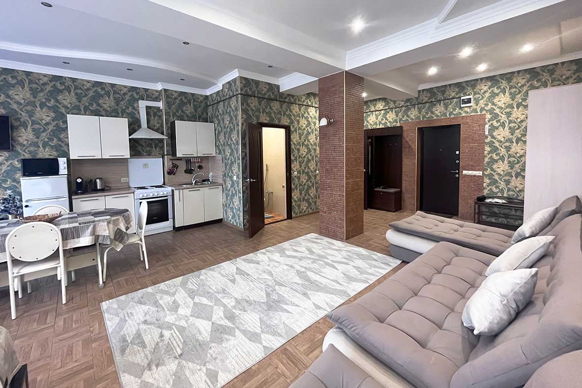 Квартира представляет собой спальную, гостевую зону и кухню. В квартире два санузла. Один санузел оснащен ванной. Второй – унитазом. В спальной зоне установлена двуспальная кровать, в гостевой зоне – раскладной диван и телевизор.