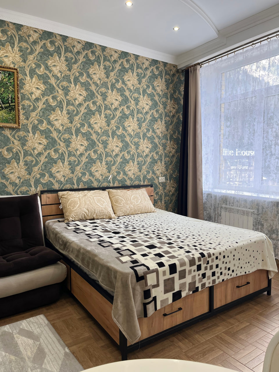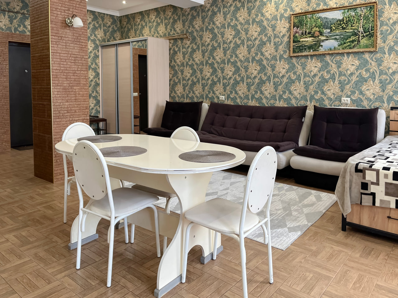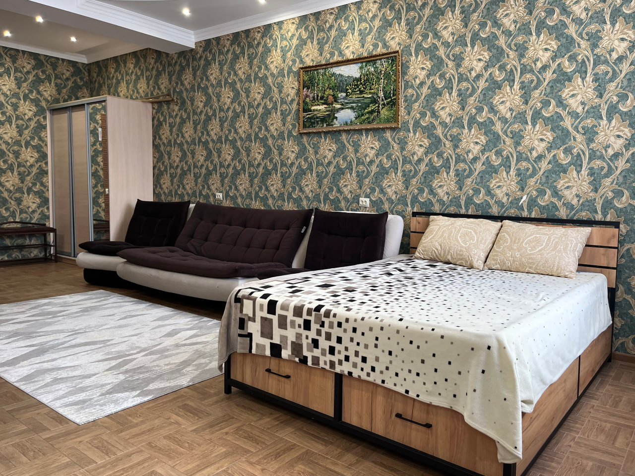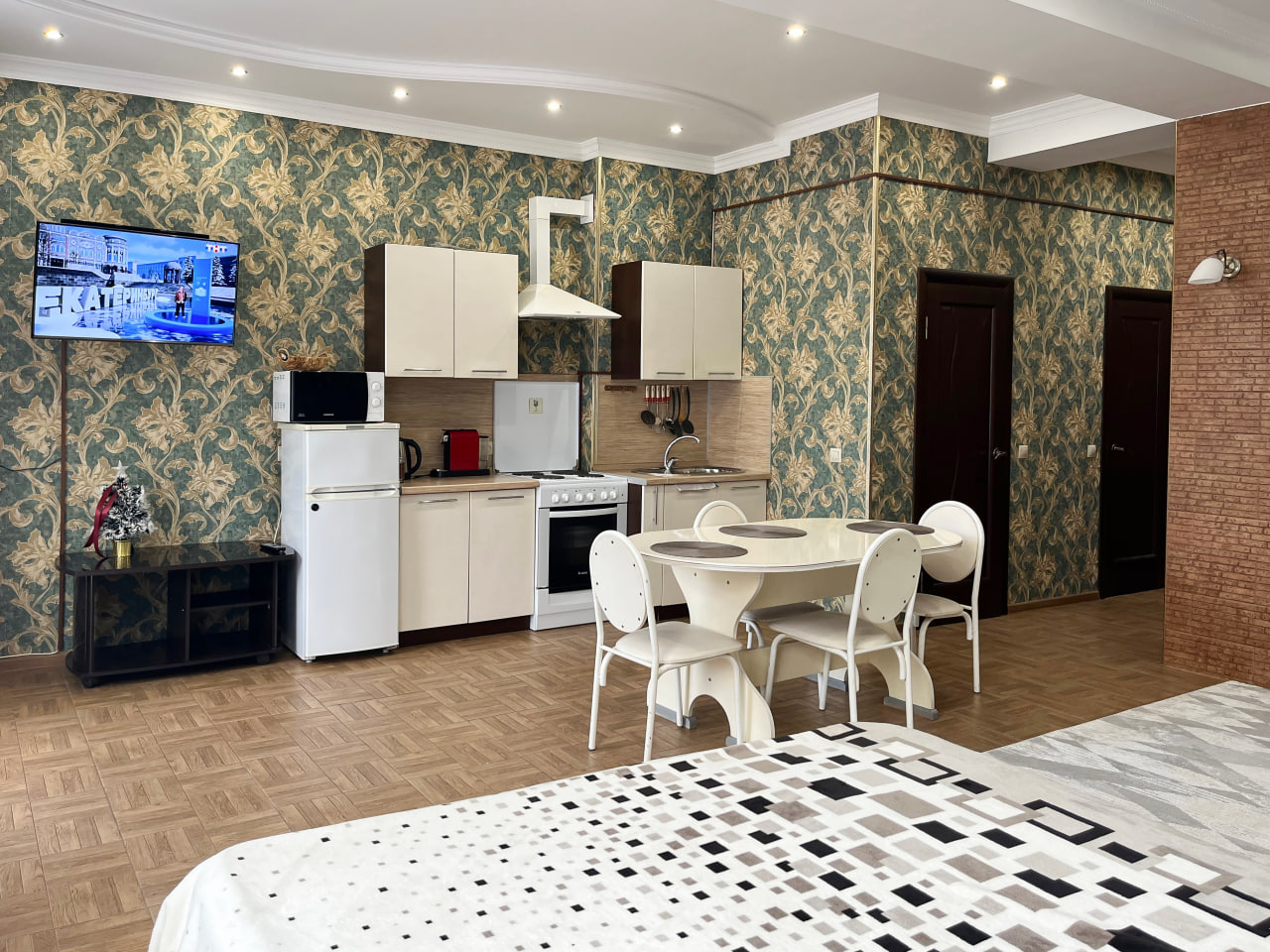 Квартира представляет собой спальную, гостевую зону и кухню. В квартире два санузла. Один санузел оснащен ванной. Второй – унитазом. В спальной зоне установлена двуспальная кровать, в гостевой зоне – раскладной диван и телевизор.