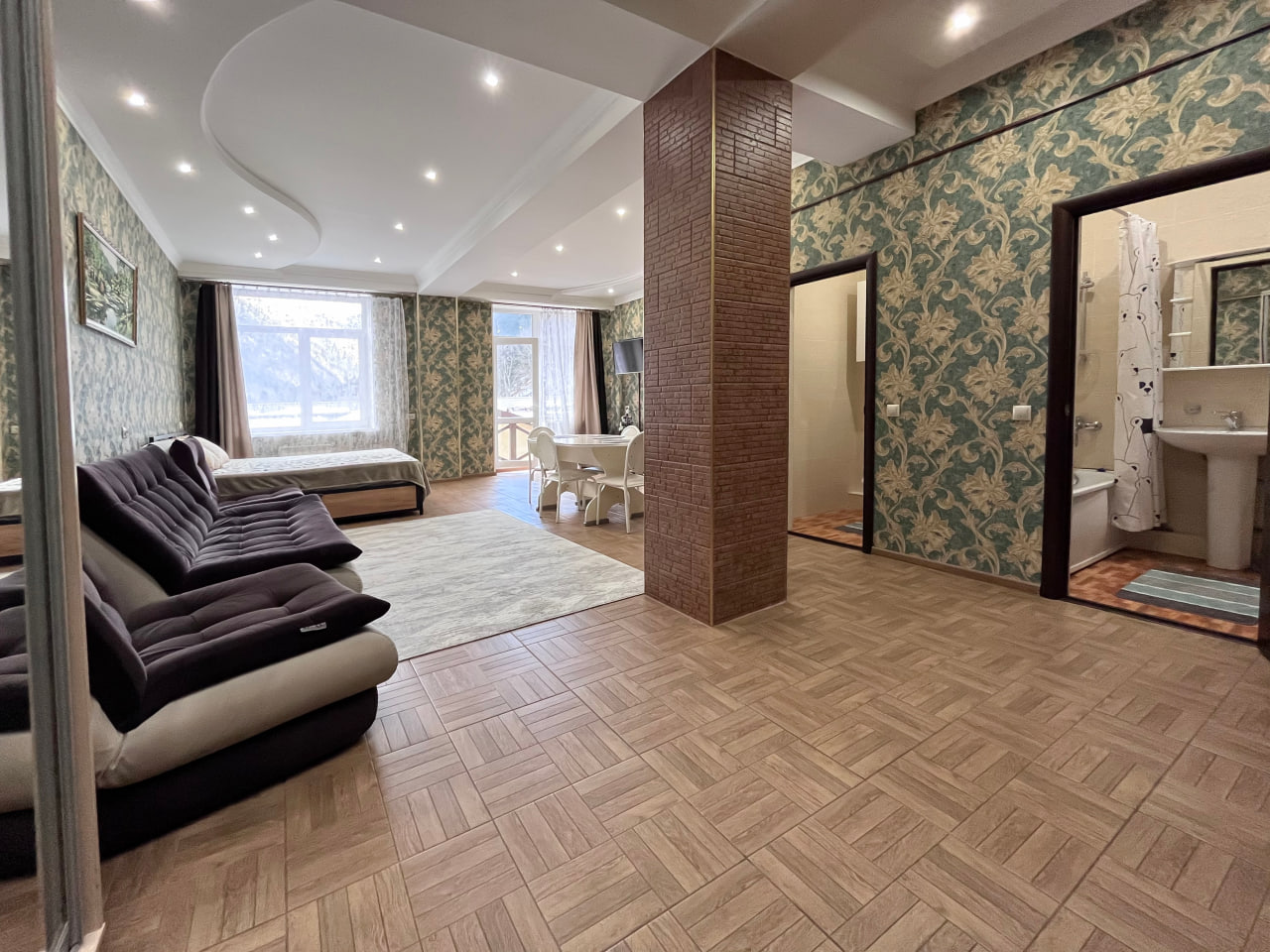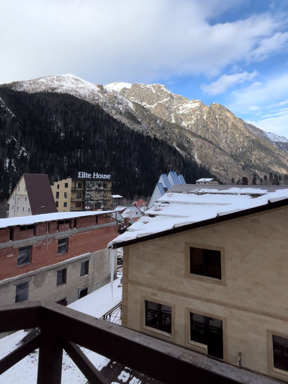 Окна и балкон выходят на вершины гор и лес Домбая.
