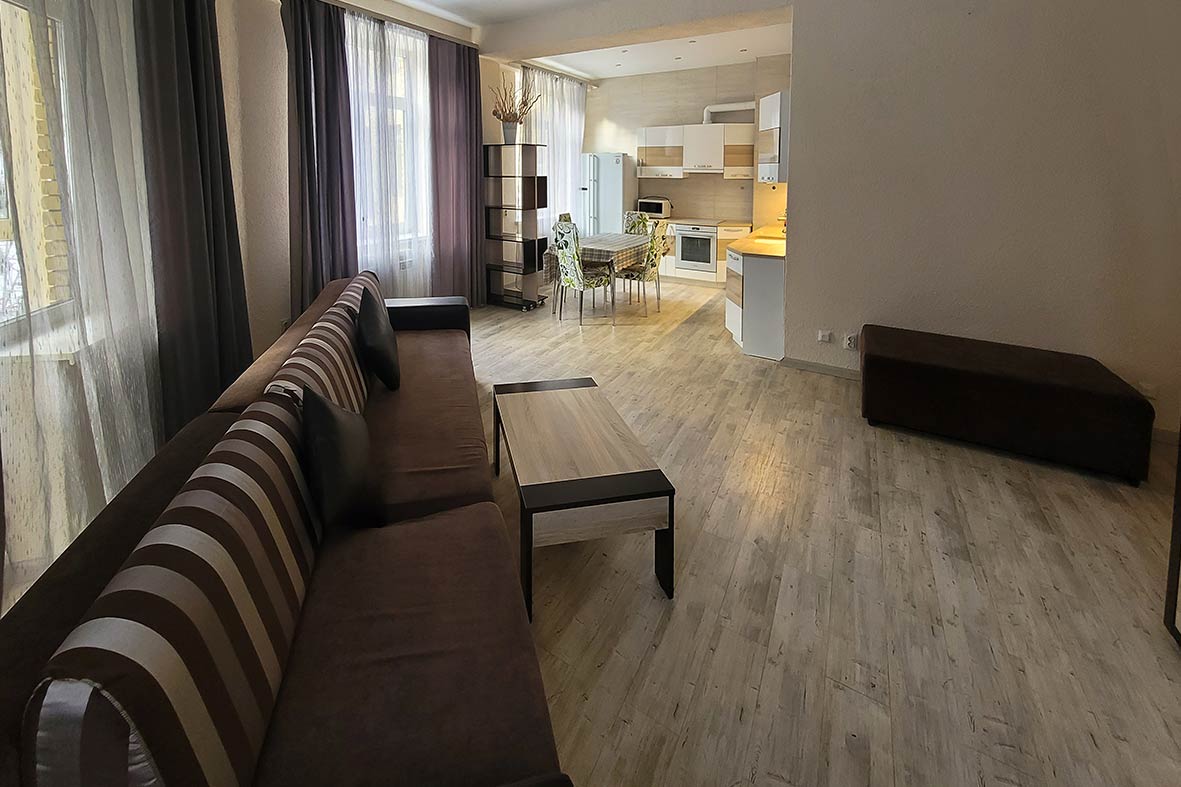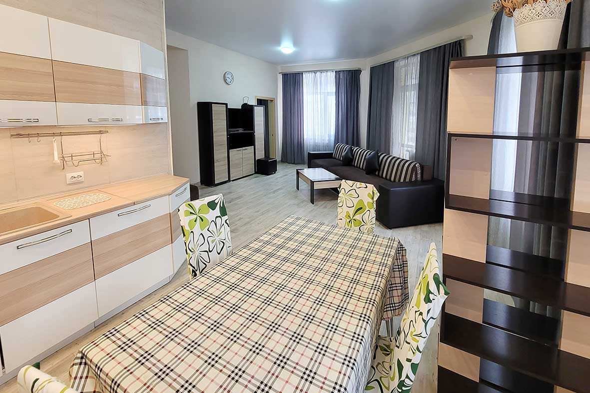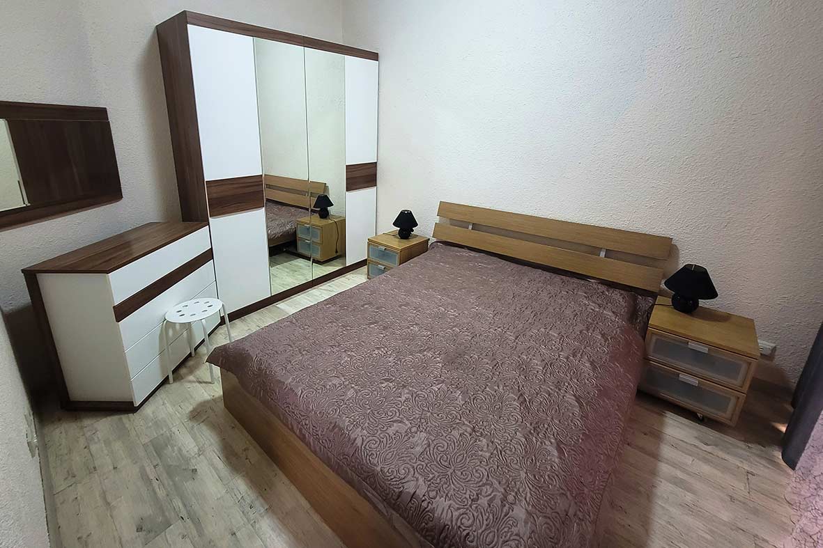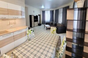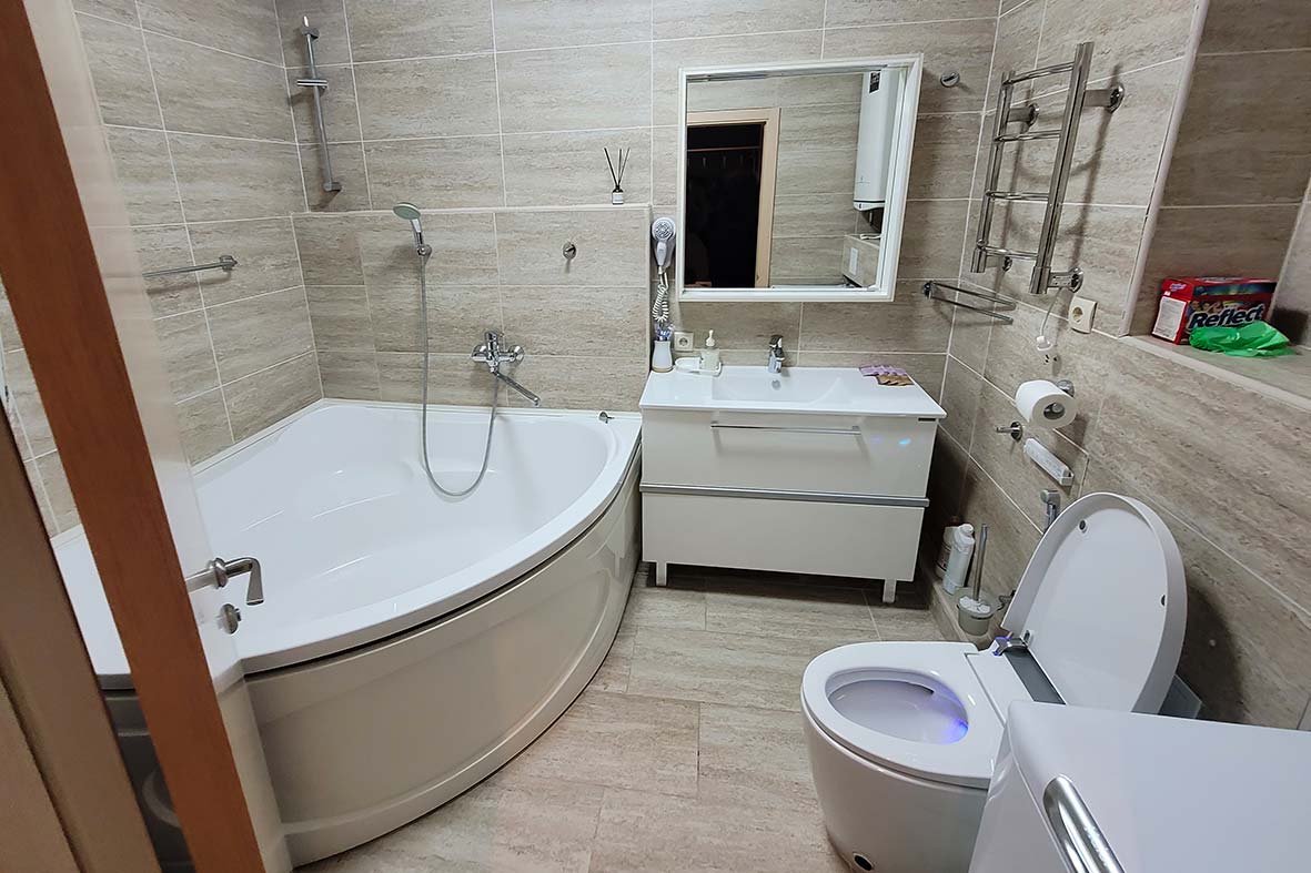 Квартира представляют собой гостиную с кухней и изолированную спальню. Ванная комната оснащена ванной и смарт унитазом. В спальне установлена двуспальная кровать, в гостиной – раскладной диван.