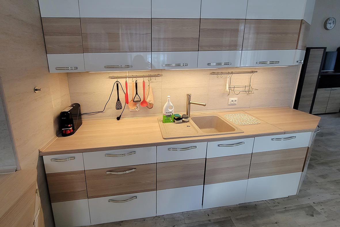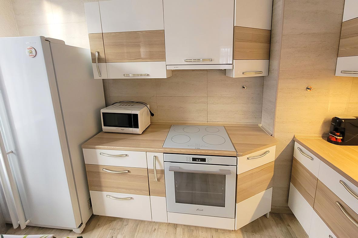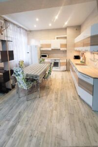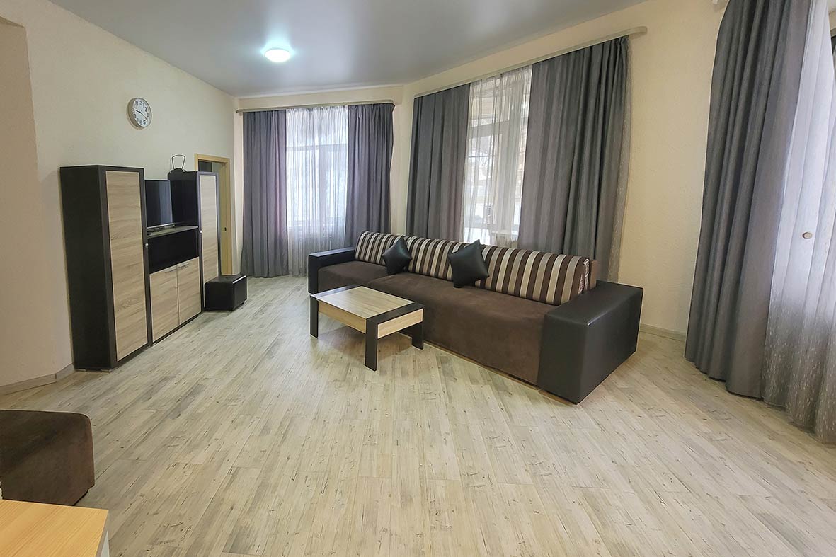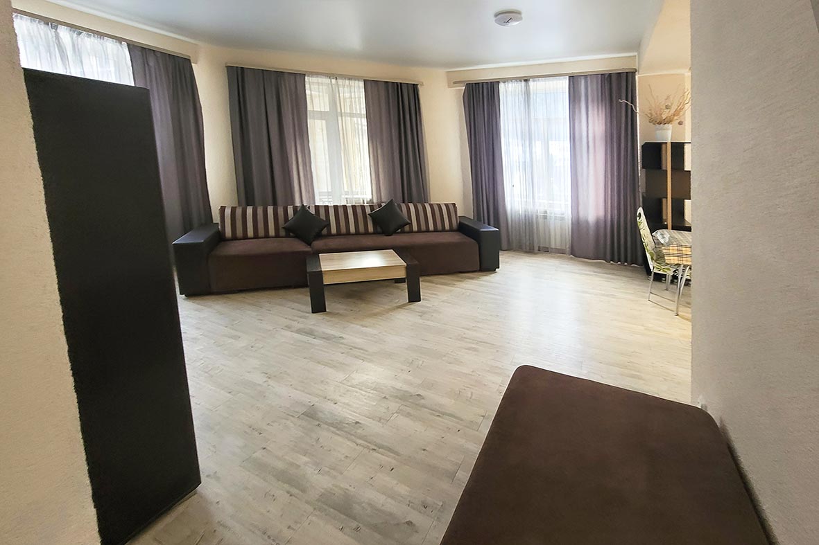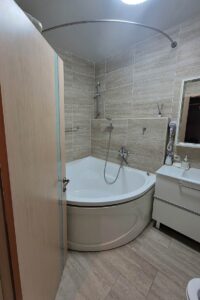 Квартира представляют собой гостиную с кухней и изолированную спальню. Ванная комната оснащена ванной и смарт унитазом. В спальне установлена двуспальная кровать, в гостиной – раскладной диван.