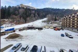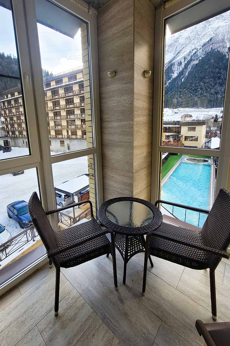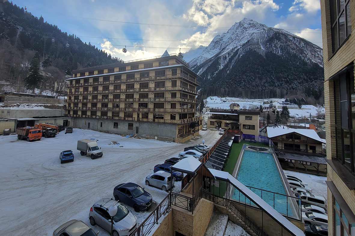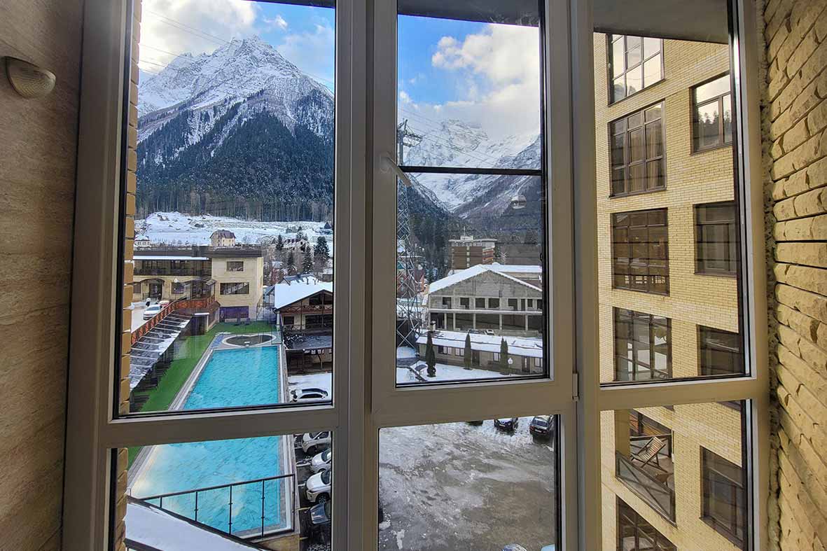 В квартире два балкона, из панорамных окон которых, открывается вид на горы, лес и канатную дорогу Домбая.