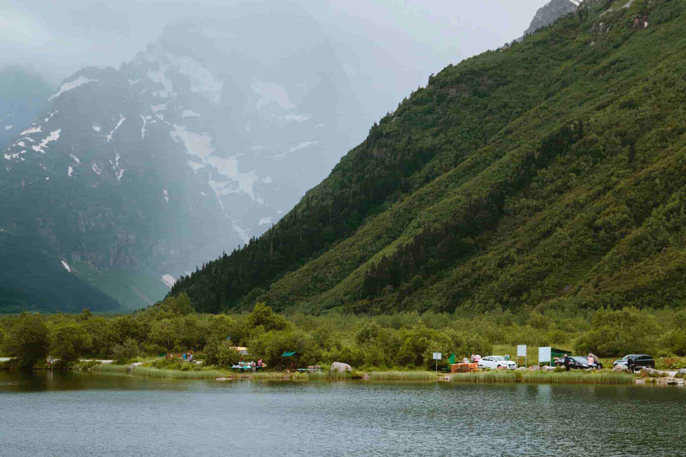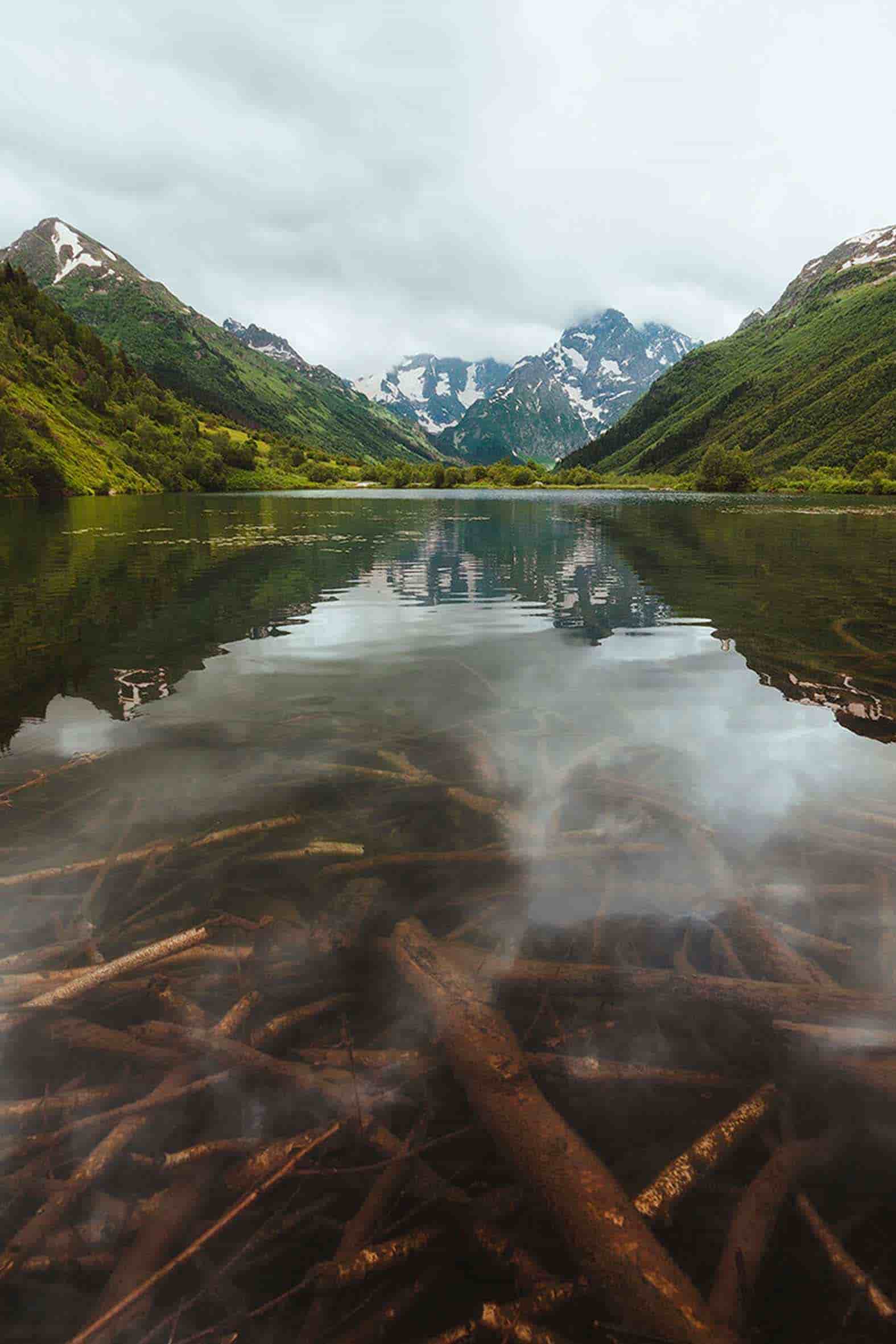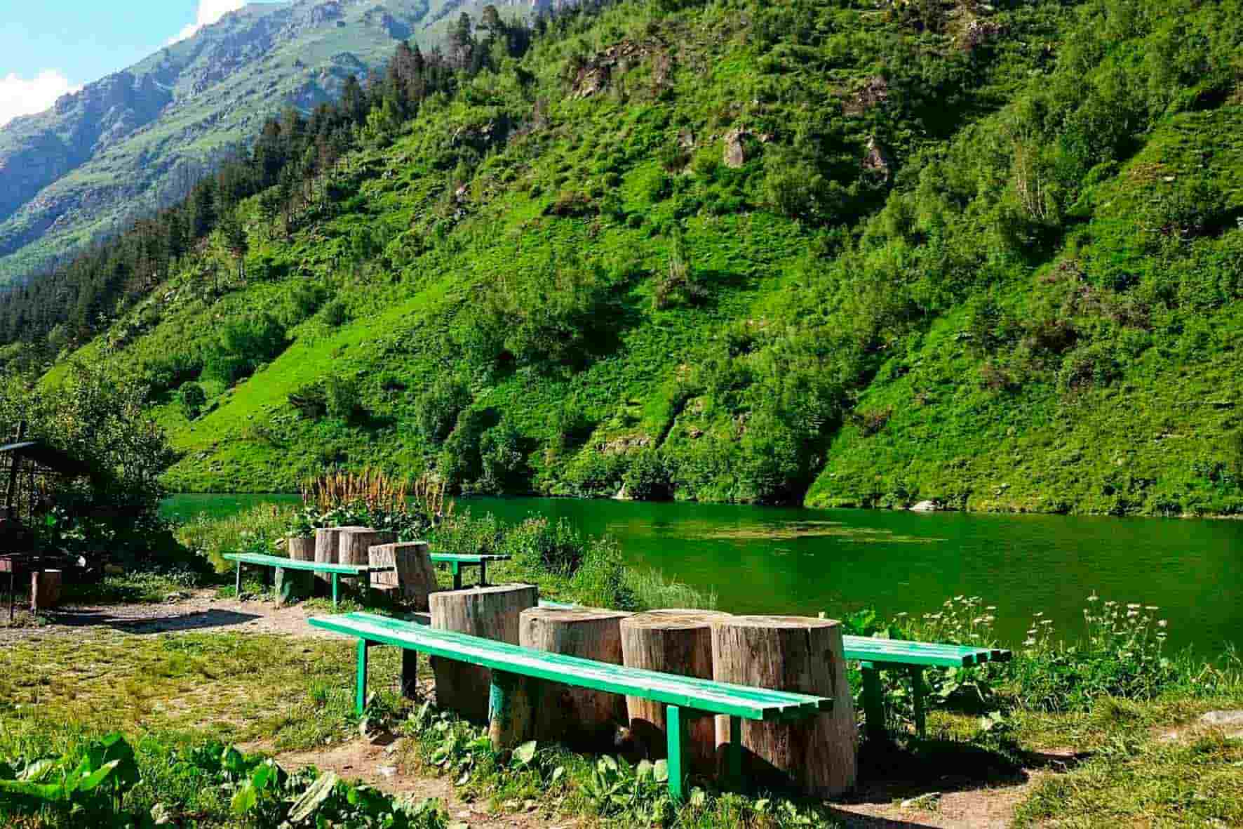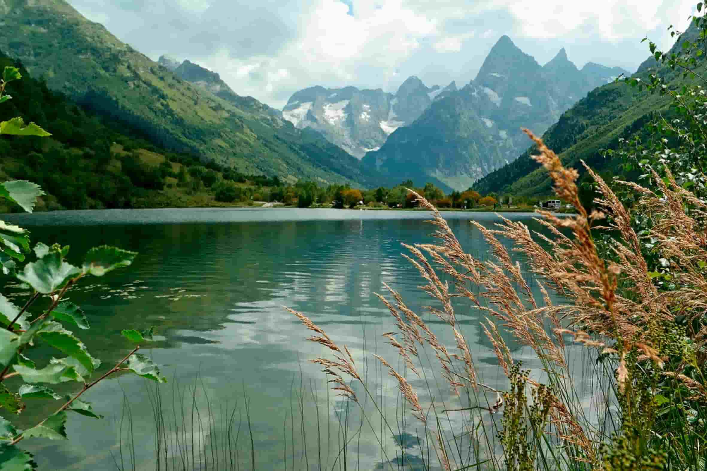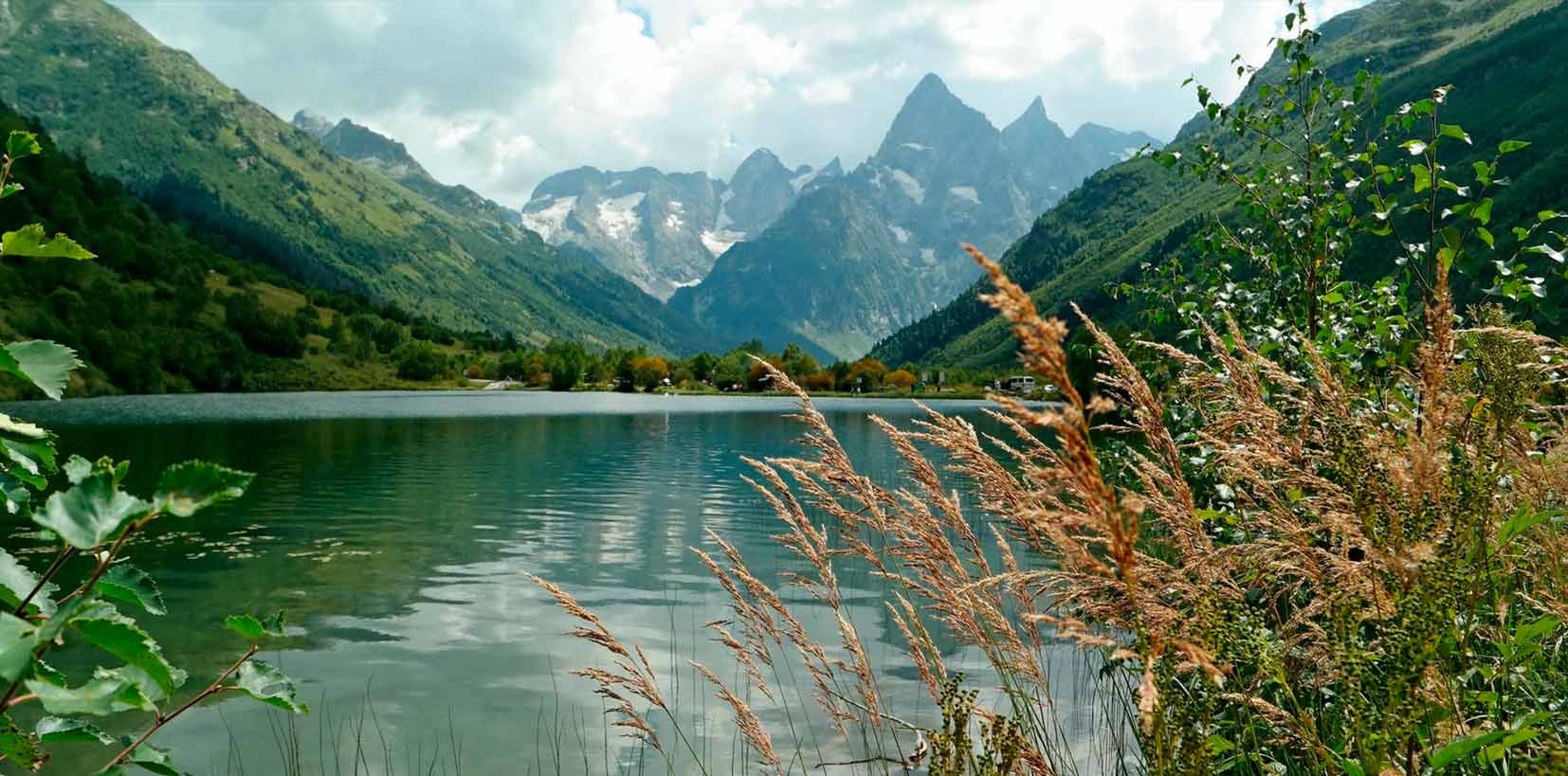 Завораживающие виды Вам обеспечены: в зеркальной глади озера отражаются живописные заснеженные вершины Главного Кавказского хребта.